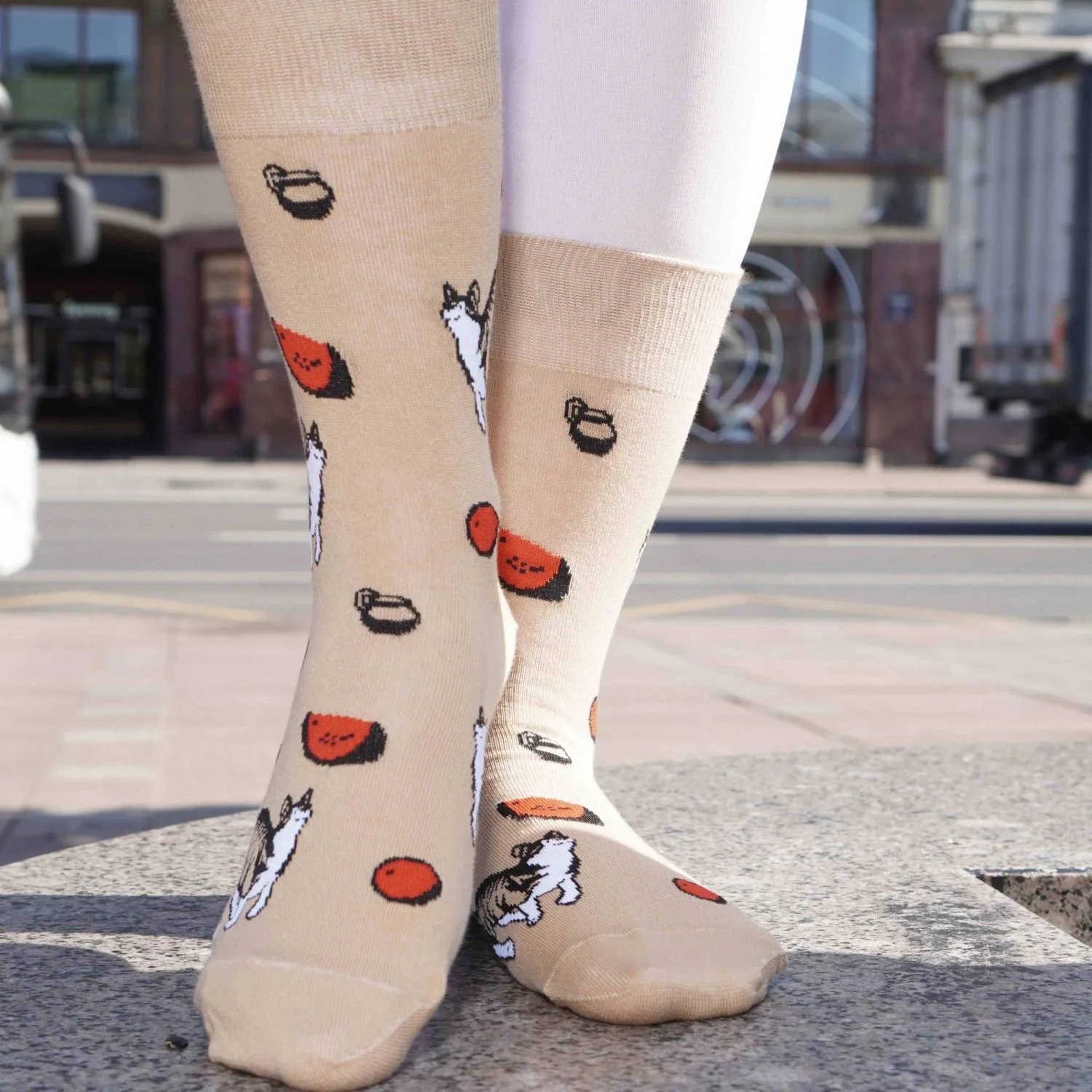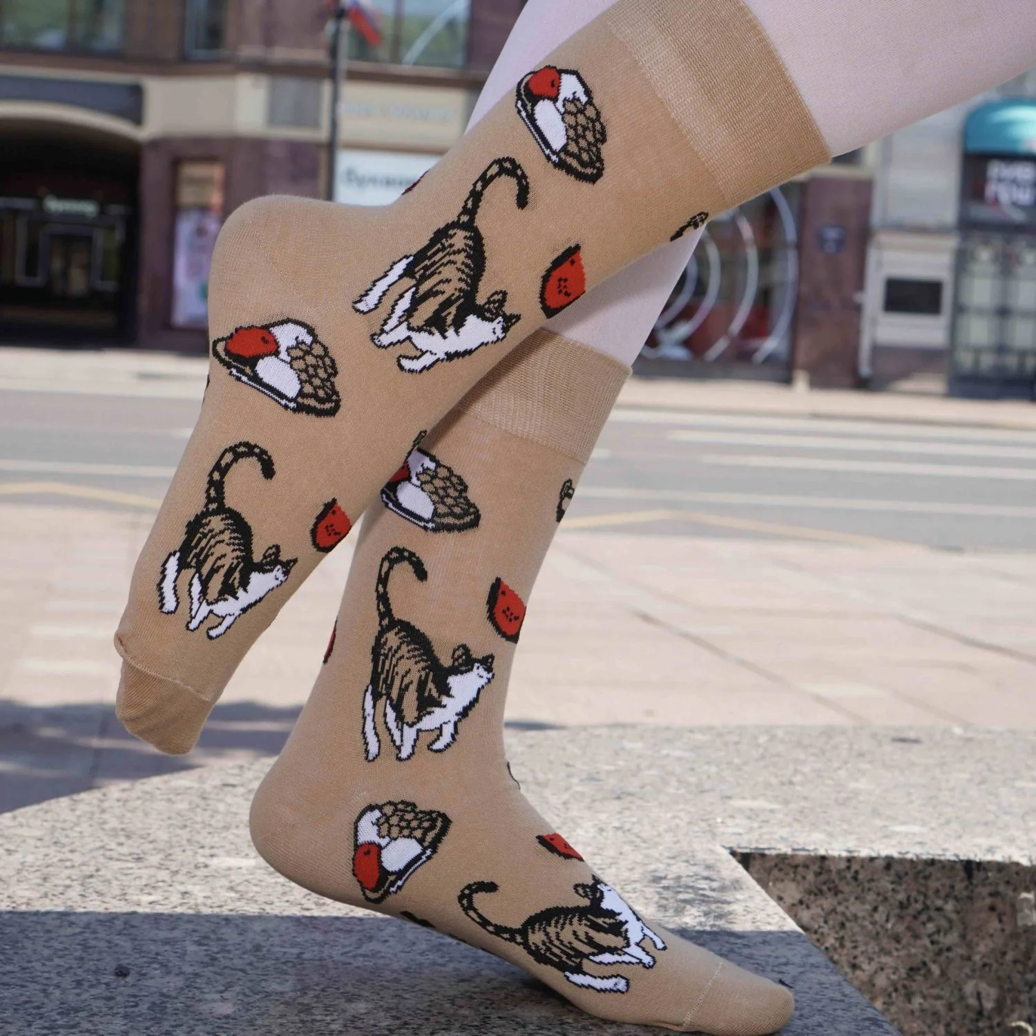Любителям чайных церемоний и трапезы на свежем воздухе посвящается. В основе дизайна этой пары носков - работа художника-портретиста Бориса Михайловича Кустодиева “Купчиха за чаем” из собрания Государственного Русского музея. При переносе картины на носочный холст часть композиции была утеряна, но мы компенсировали это упущение обилием котиков и яств. Судя по веселой припрыжке мурлыки, он тот еще ценитель арбузной мякоти и фарфоровых сливочников. Носки цвета нюд с небольшими яркими акцентами идеально впишутся в гардероб самого претенциозного эстета.