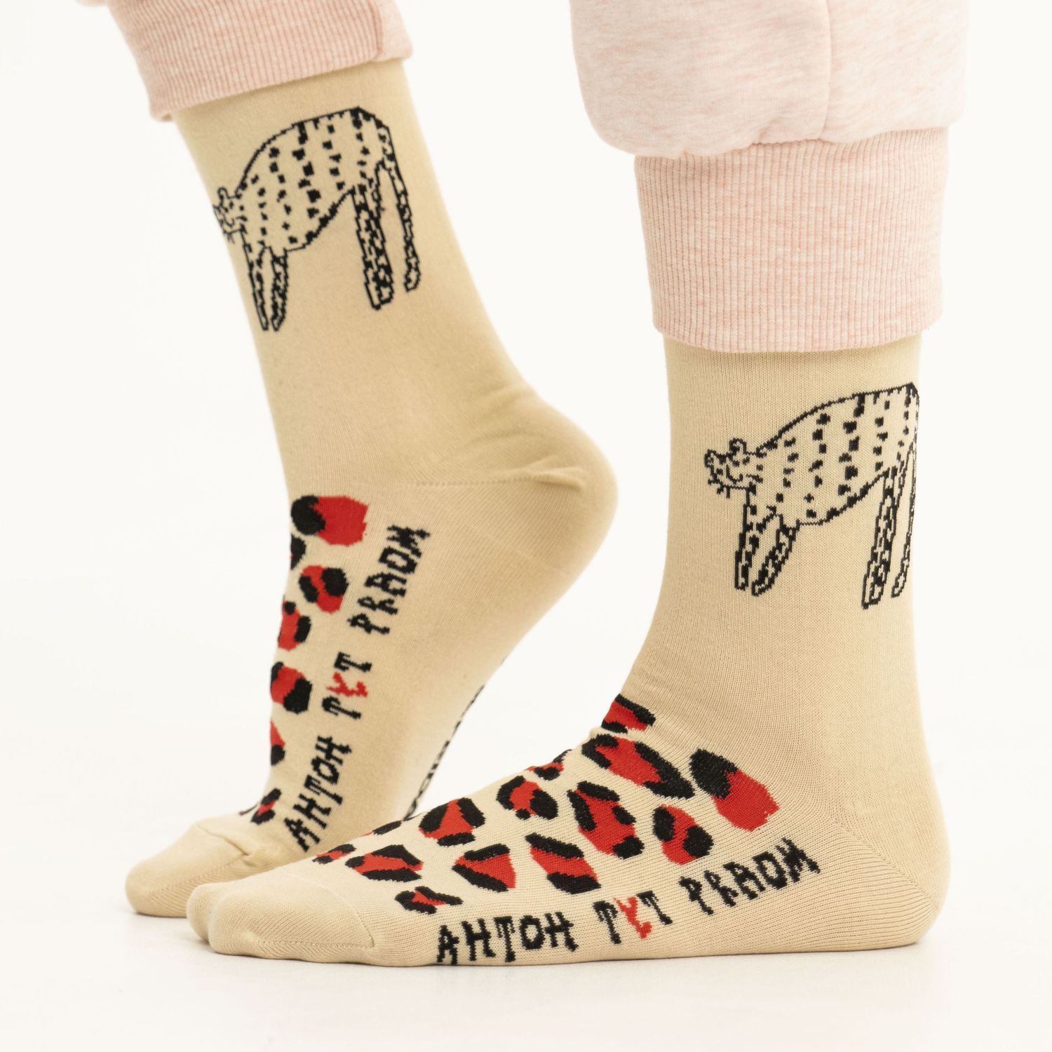 Модель носков “Незапятнанный леопард” выпущена совместно с Центром поддержки людей с аутизмом «Антон тут рядом». Дизайн выполнен по эскизам рисунков студентов Центра. Часть средств от продажи будет перечисляться Центру «Антон тут рядом».