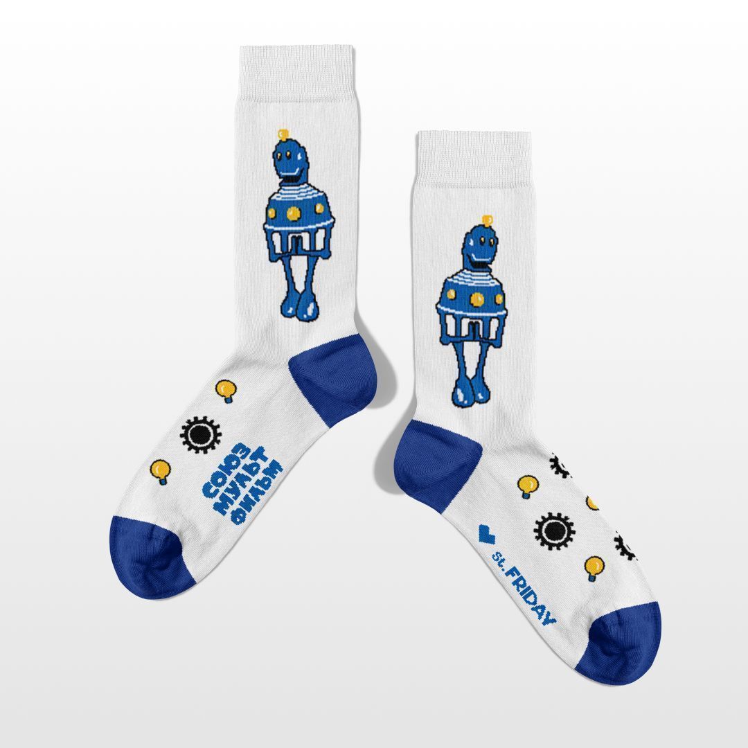 В нашей соместной коллекции с киностудией «Союзмультфильм» мы выпустили белые авторские носки с роботом из м/ф «Тайна третьей планеты». Практичная, как и все прочие носки, модель подчеркнет бесконечную молодость вашего сердца, а может и сойдет за трогательный подарок для друзей или родителей.