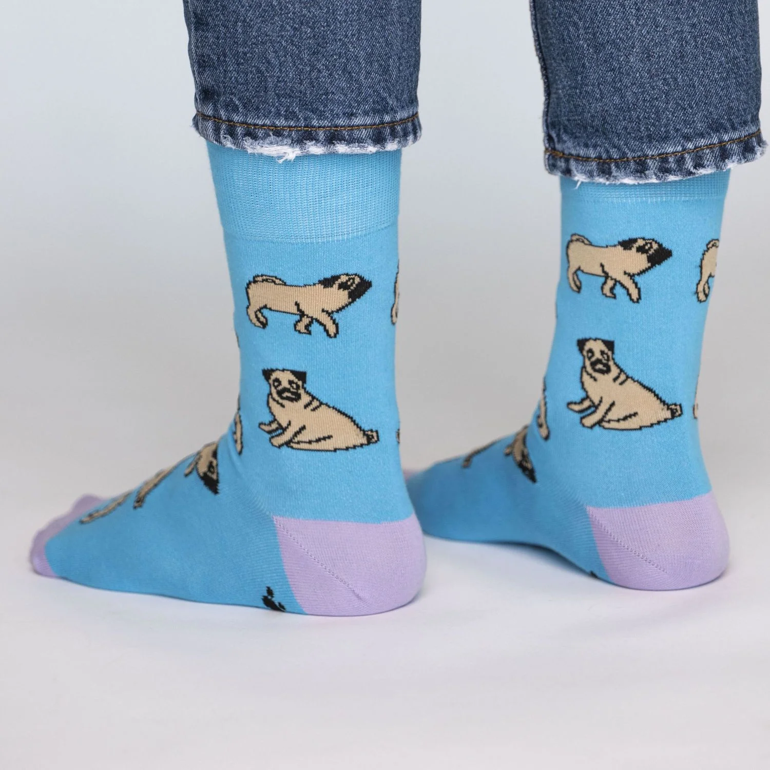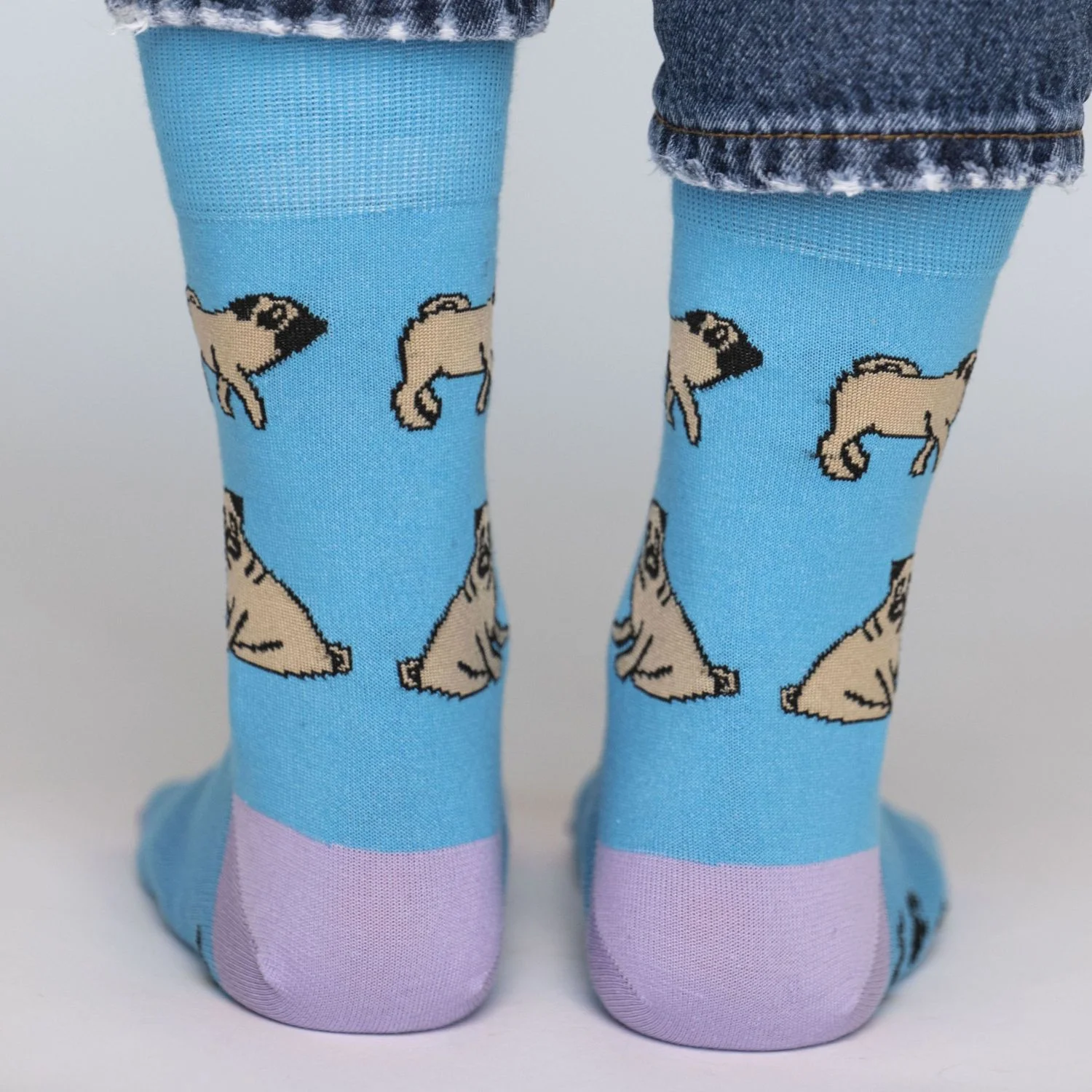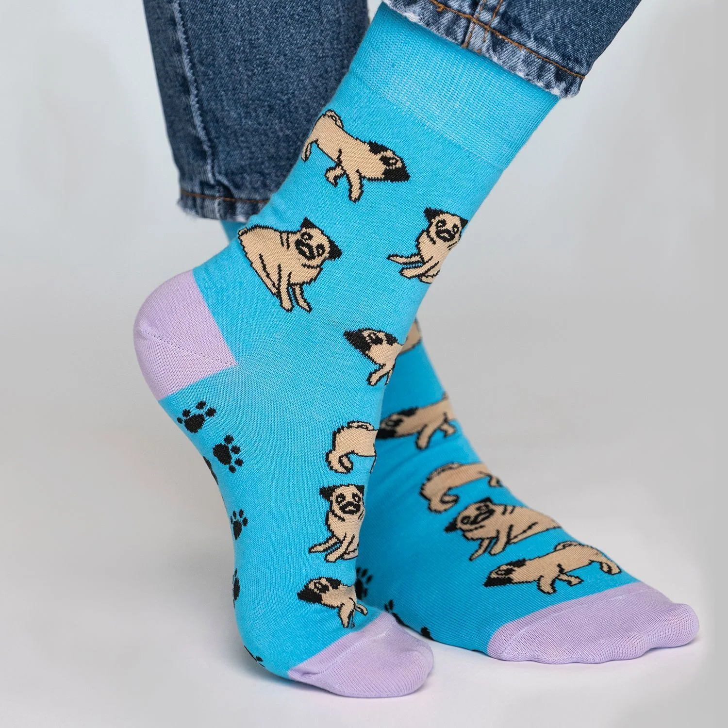Умиротворенный мопс, словно маленький просветленный буддийский монах бредёт вслед за своим таким же спокойным хозяином. Порой его одолевают беспокойные мысли, и тогда он ворчит себе под нос то ли не очень страшные проклятия, то ли мантры. Наши бирюзовые носки с паттерном из мопсов, хоть и не гарантируют полного просветления, но немножечко спокойствия и гармонии всё же гарантированно принесут.