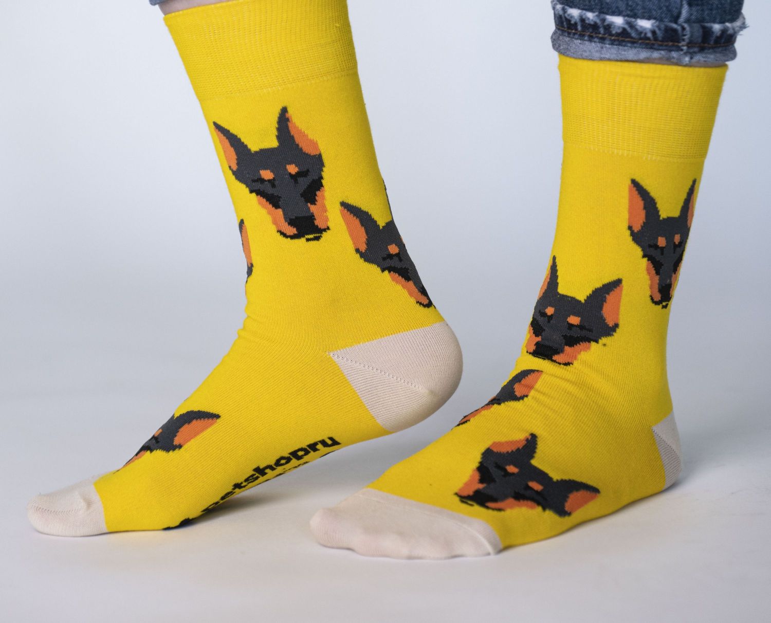 Желтые носки с бежевой пяткой “Типичный доберман” - часть совместного с Petshop.ru благотворительного проекта “Мир, дружба, лапки!”. Основная цель проекта – привлечь внимание к проблеме бездомных животных и оказать поддержку приютам, чьи подопечные ищут любящую семью. В проекте приняли участие двенадцать приютов из Москвы, Санкт-Петербурга, Екатеринбурга, Перми, Казани, Ростова-на-Дону, Архангельска и Калуги. Часть прибыли от продажи коллекции мы потратим на нужды приютов-партнеров.