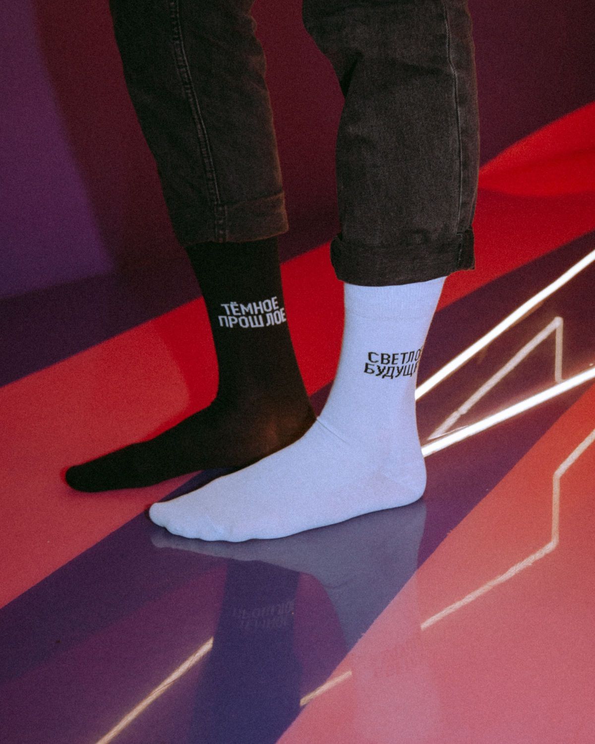 Модель непарных носков (один черный, второй белый) “Живи настоящим” - придумана финалистом всероссийского конкурса “St.Friday Contest 2020: Вперед в настоящее” Ульяной Серковой.