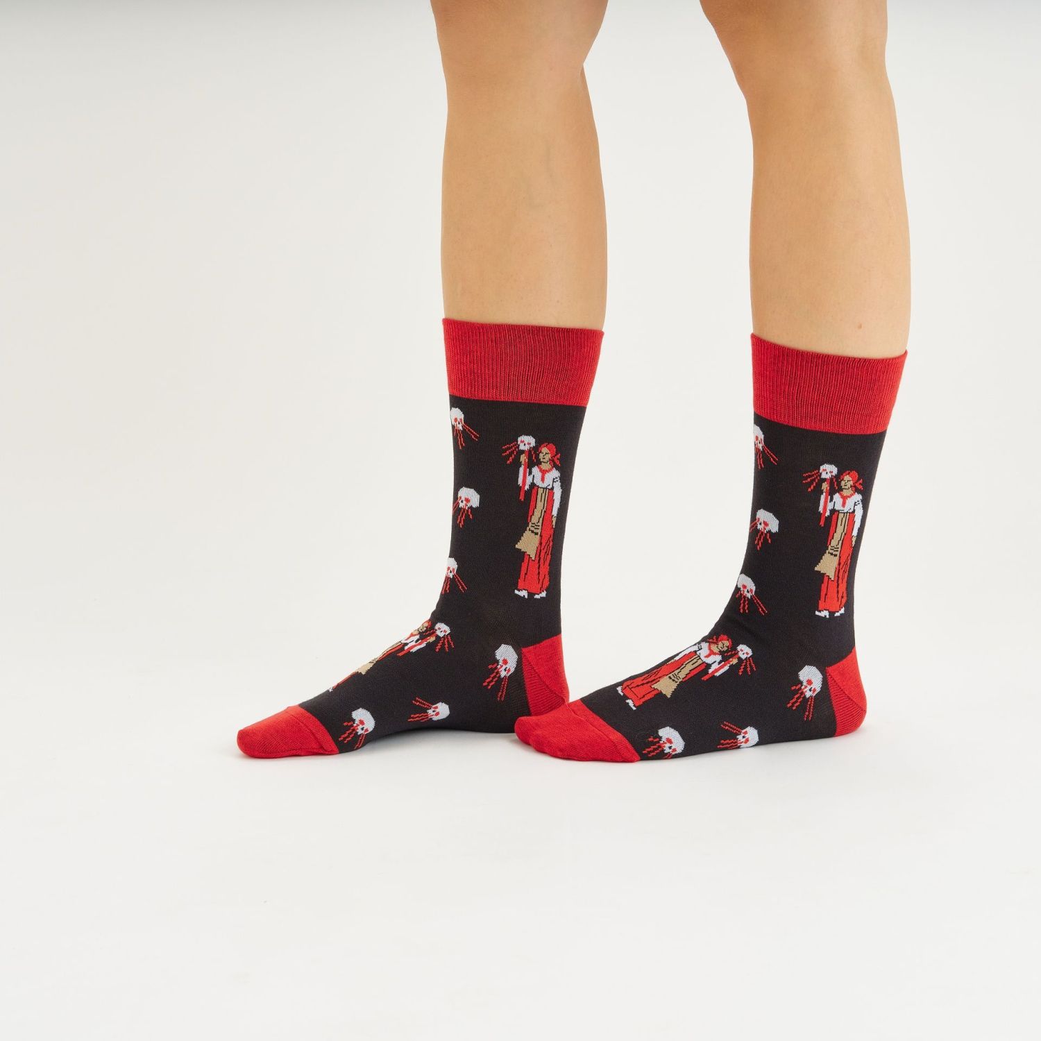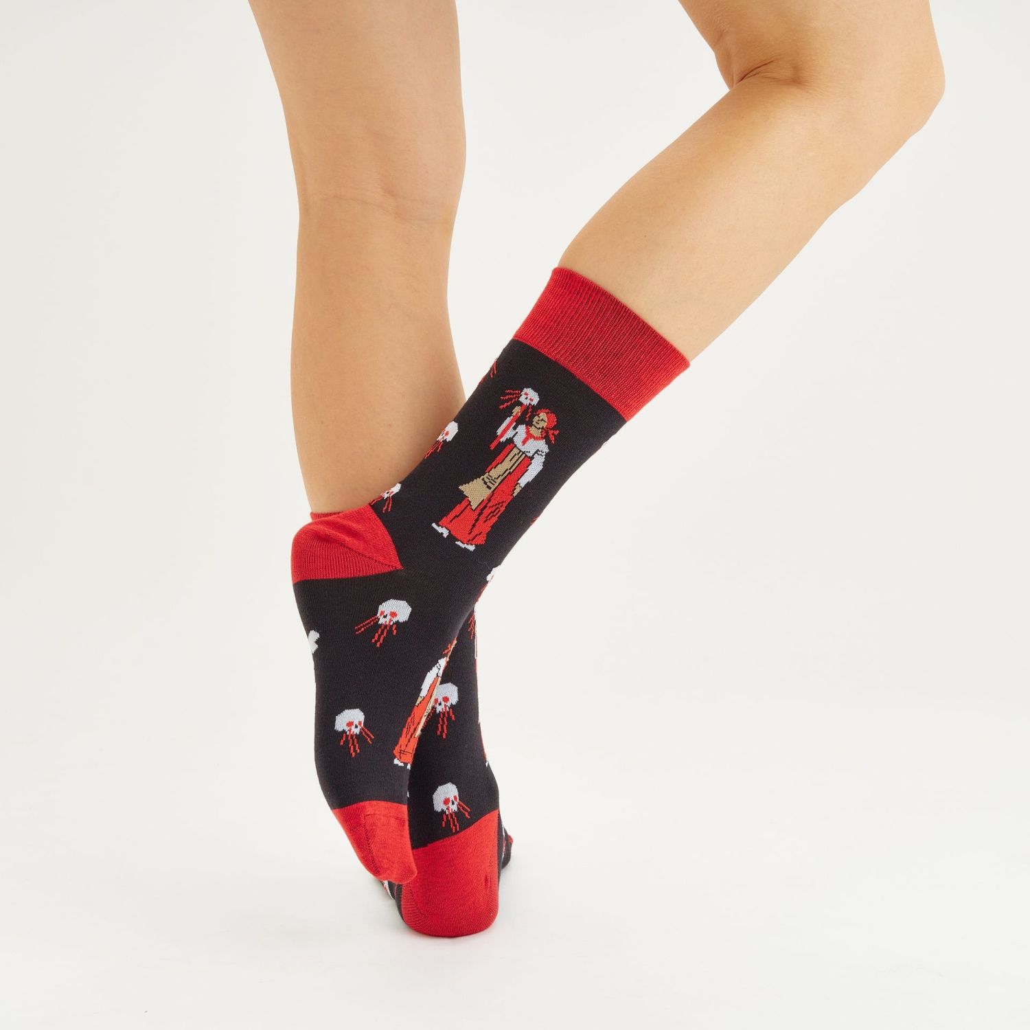 Дивный сюжет русских сказок перекочевал из ларца, созданного по мотивам русского фольклора, на дизайнерские носки. Тот случай, когда искусство одинаково хорошо смотрится и в темпере, и в хлопке. Как гласит история, несмотря на мистические атрибуты в виде светящегося черепа, у Василисы Прекрасной всё заканчивается удачно. Таинственные носки цвета самой тёмной ночи для волшебных путешествий со счастливым концом.