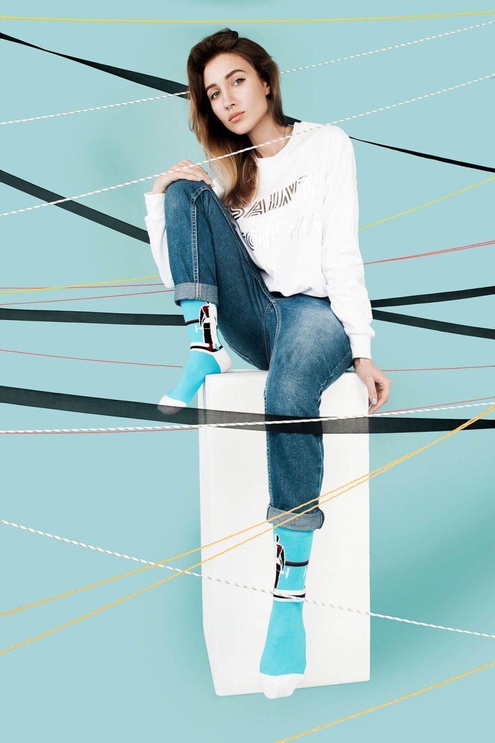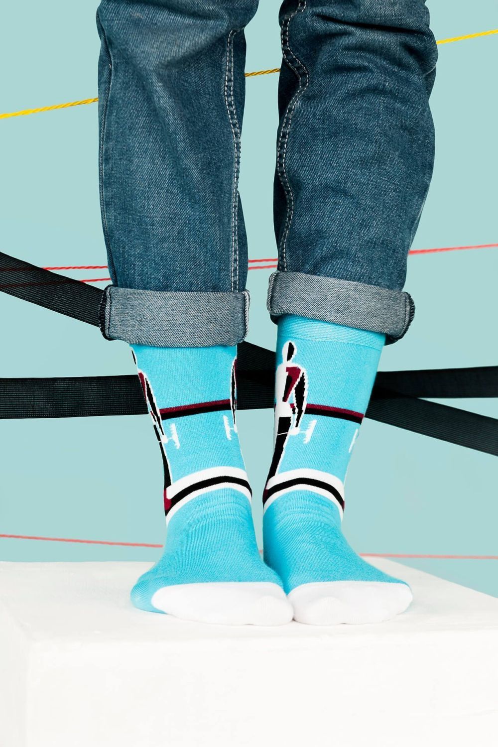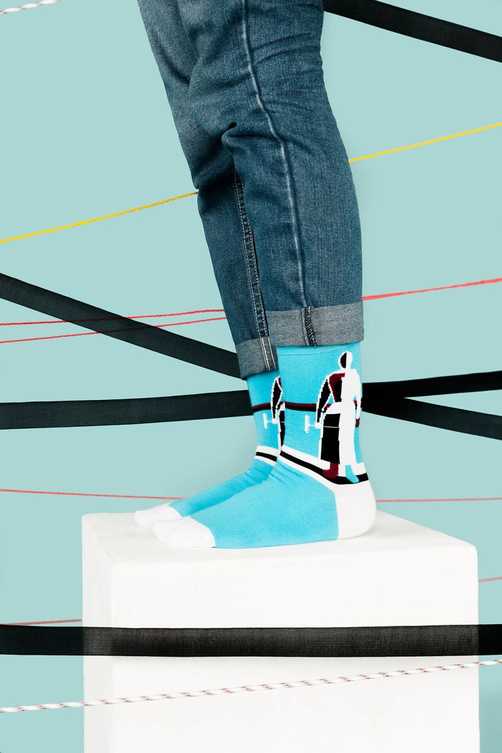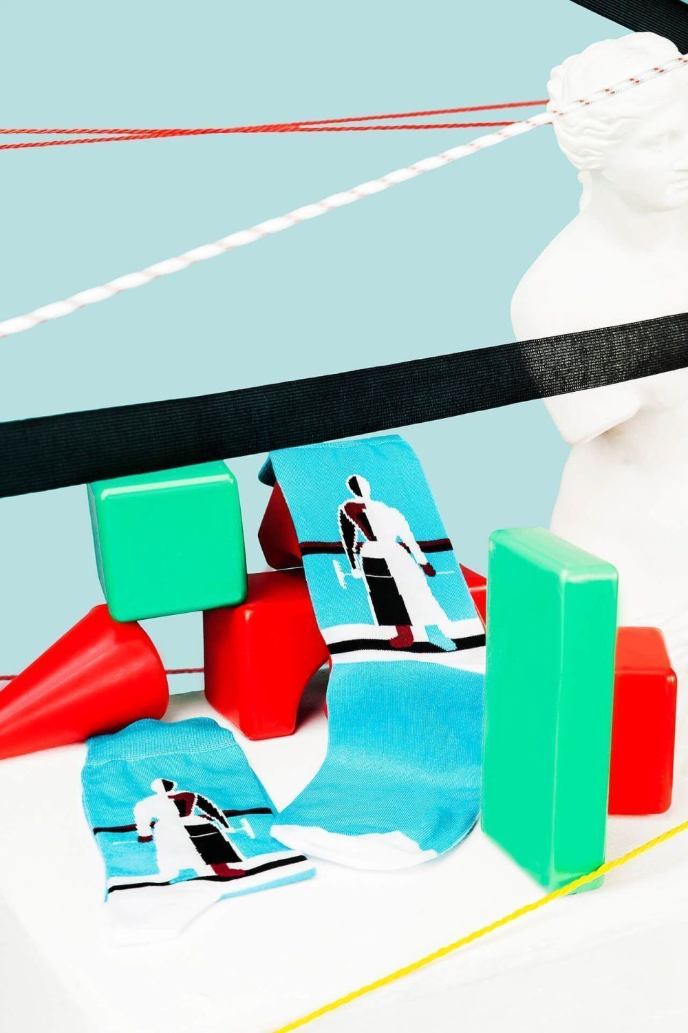 Фигура эта состоит из геометрических ярких, насыщенных оттенков. Трансформация художественного произведения в дизайн носков была проведена максимально бережно. Получилась очень красивая пара носков, идеально подходяще под джинсы, стиль кежуал или спорт. Впрочем, уверяют стилисты, под классический костюм при особом случае — тоже.