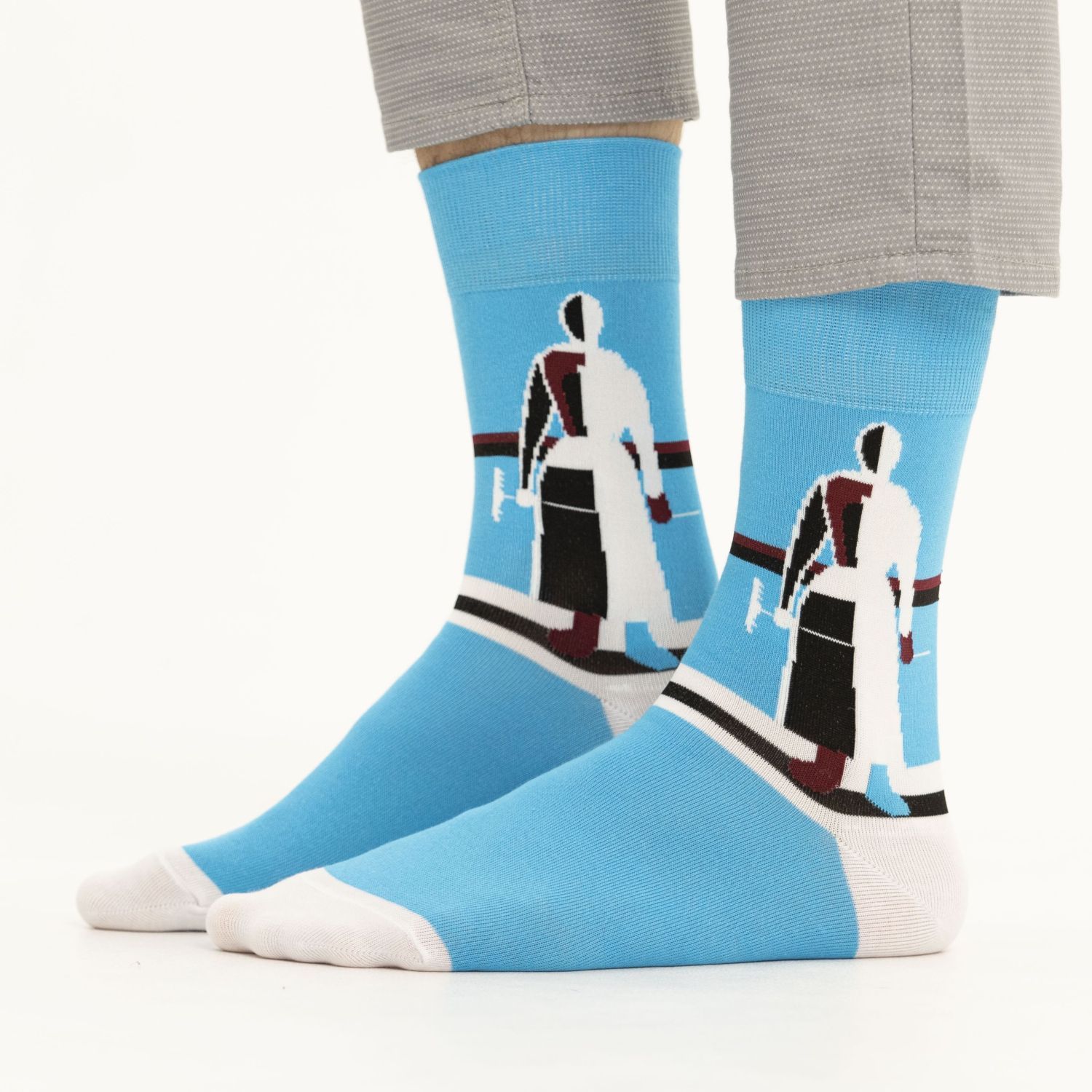 Еще одна работа основоположника супрематизма Каземира Малевича, "Женщина с граблями" была аккуратно адаптирована под фабричные возможности St.Friday socks и включена в капсульную коллекцию носков, выпущенную вместе с Третьяковской галерей. На манер очень популярных в начале 20 века фигур (как, например, «женщина с веслом»), художник в свое время создал свою версию современной женщины.