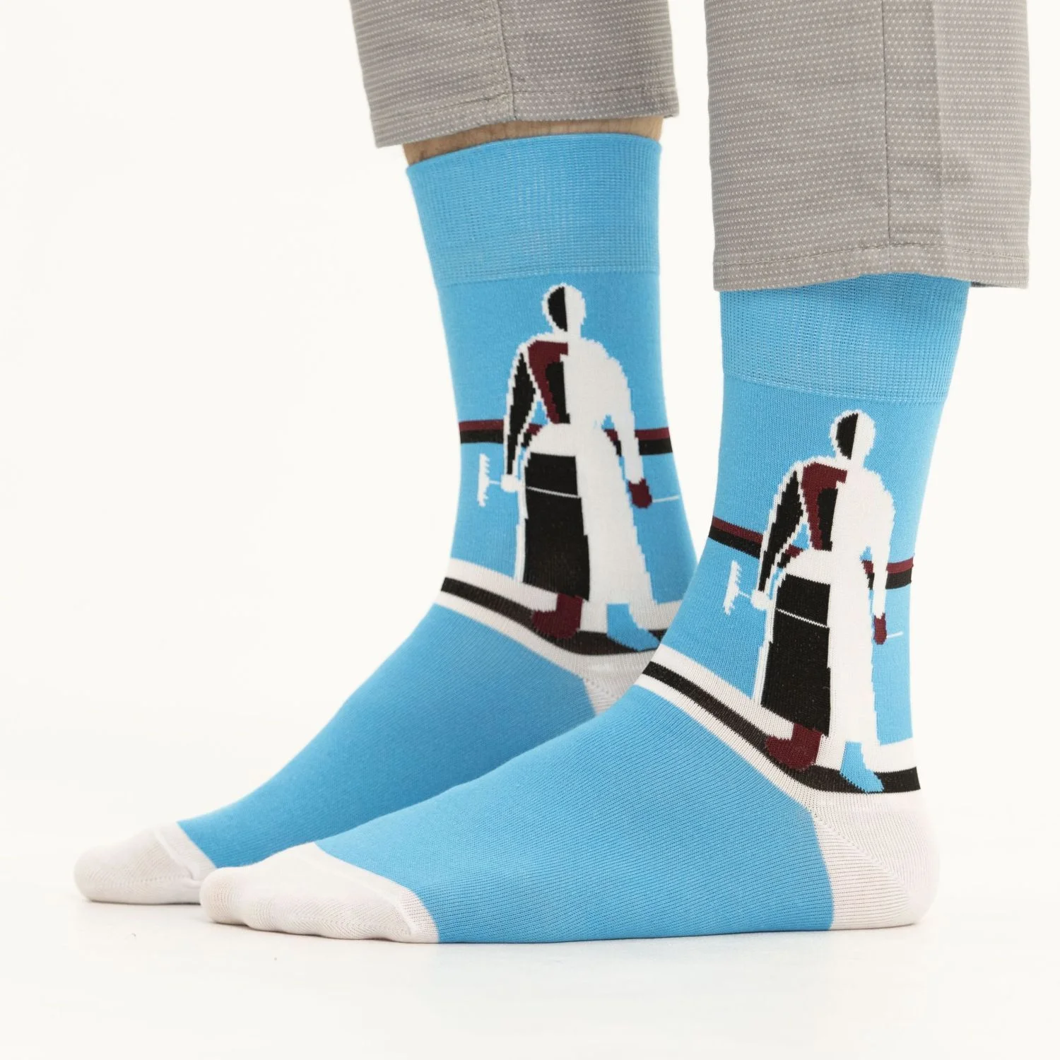 Фигура эта состоит из геометрических ярких, насыщенных оттенков. Трансформация художественного произведения в дизайн носков была проведена максимально бережно. Получилась очень красивая пара носков, идеально подходяще под джинсы, стиль кежуал или спорт. Впрочем, уверяют стилисты, под классический костюм при особом случае — тоже.