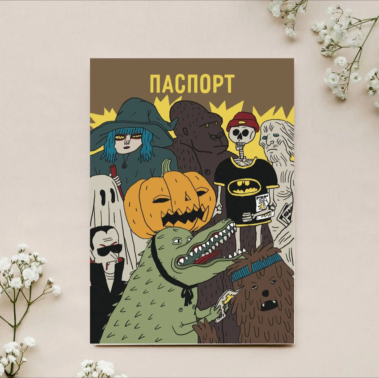 Обложка на паспорт «Хэллоуин» с изображением чудовищ — это стильный аксессуар, который добавит оригинальности к вашему паспорту. Иллюстрация на обложке создана талантливой художницей из Санкт-Петербурга Валей Карнаваловой.