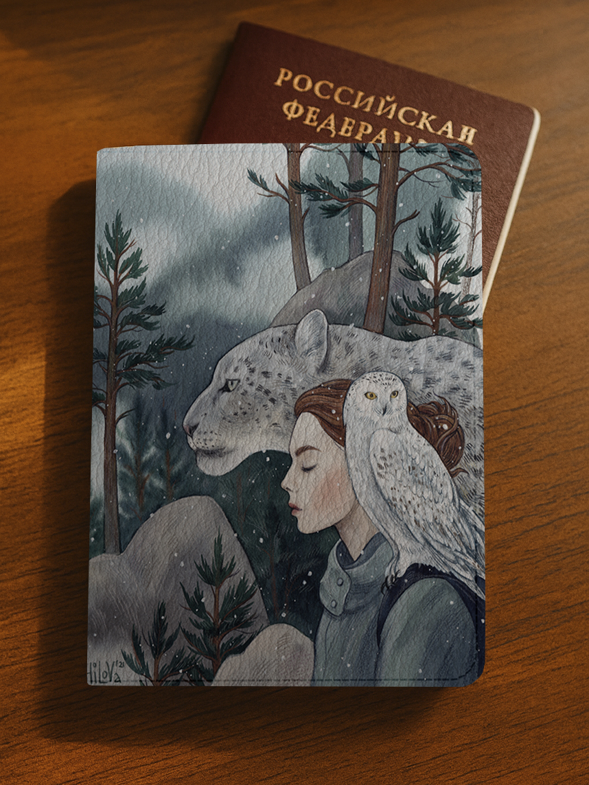 Обложка на паспорт «Снежный барс, сова и девушка» - эксклюзивный продукт от DARI DARI.