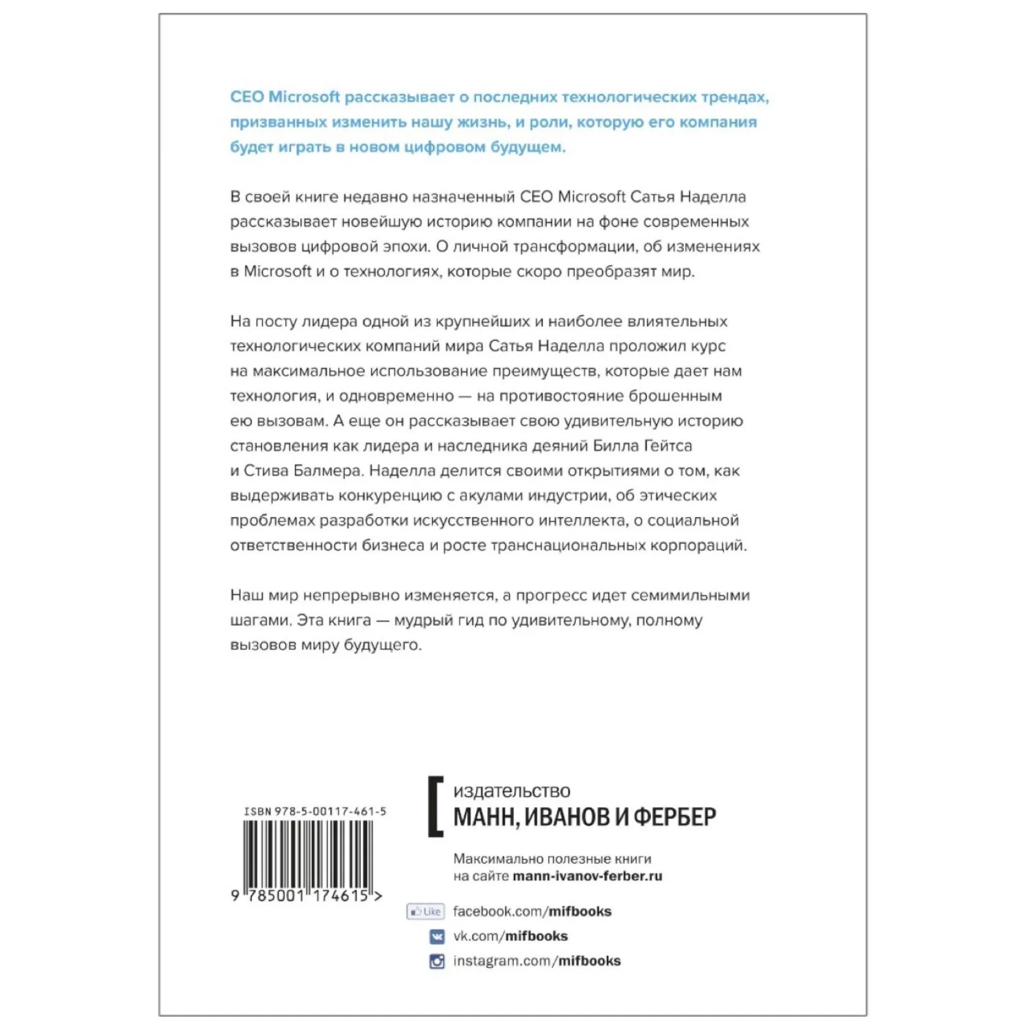 В своей книге Сатья Наделла, новый генеральный директор Microsoft, рассказывает о новейшей истории компании на фоне вызовов современной цифровой эпохи. Он говорит о личной трансформации, изменениях в Microsoft и технологиях, которые вскоре преобразуют мир. Наделла говорит о том, как конкурировать с акулами индустрии, этических проблемах развития искусственного интеллекта, социальной ответственности бизнеса и росте транснациональных корпораций.