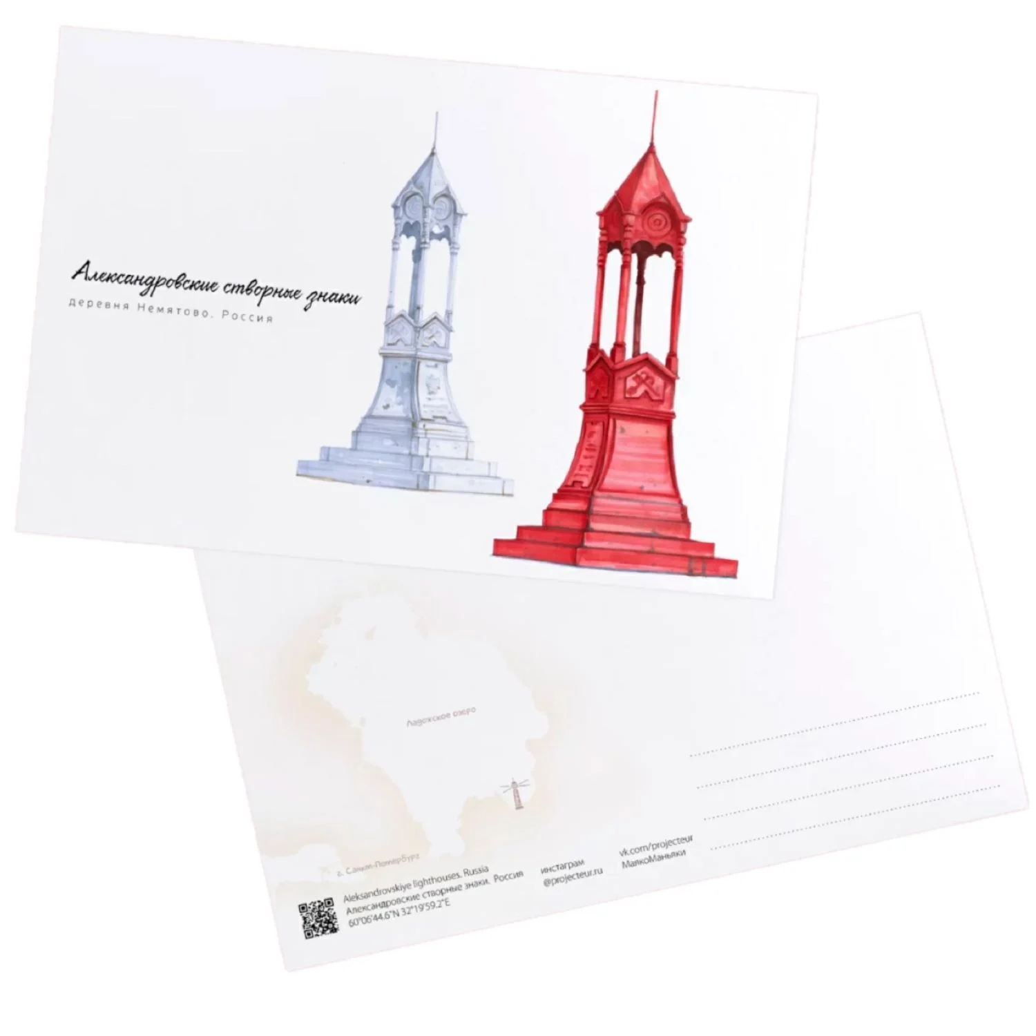 Открытка изготовлена из плотного дизайнерского картона с приятной шероховатой поверхностью. На обороте расположена схематическая карта, название и координаты маяка, а также место для написания адреса или приятных слов.