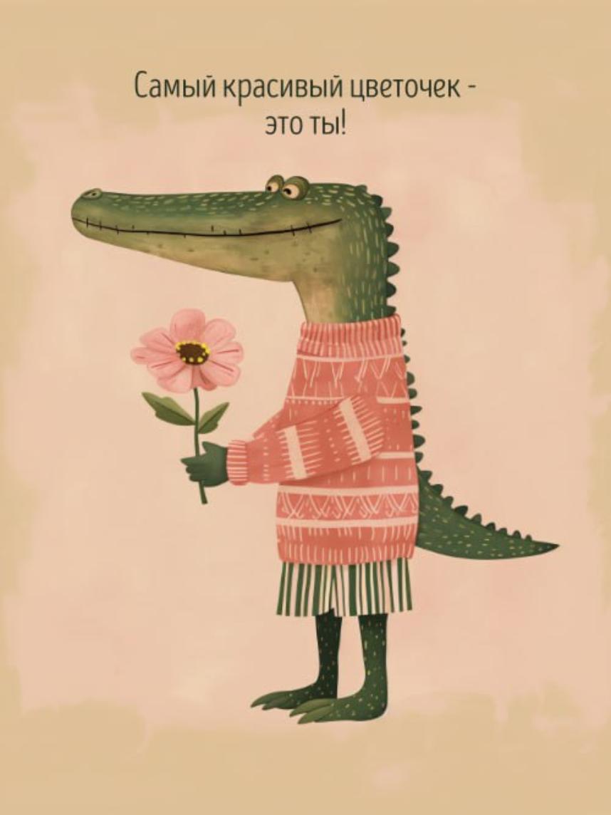 Авторская открытка с крокодилом и милой надписью «Самый красивый цветочек - это ты!».