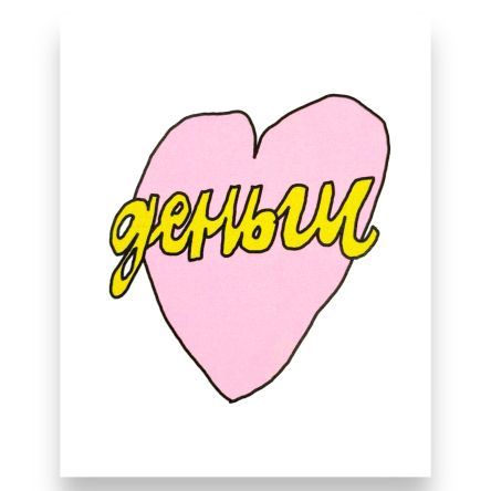 Авторская открытка с сердечком и надписью «Деньги» стандартного почтового размера: 100*150 мм.