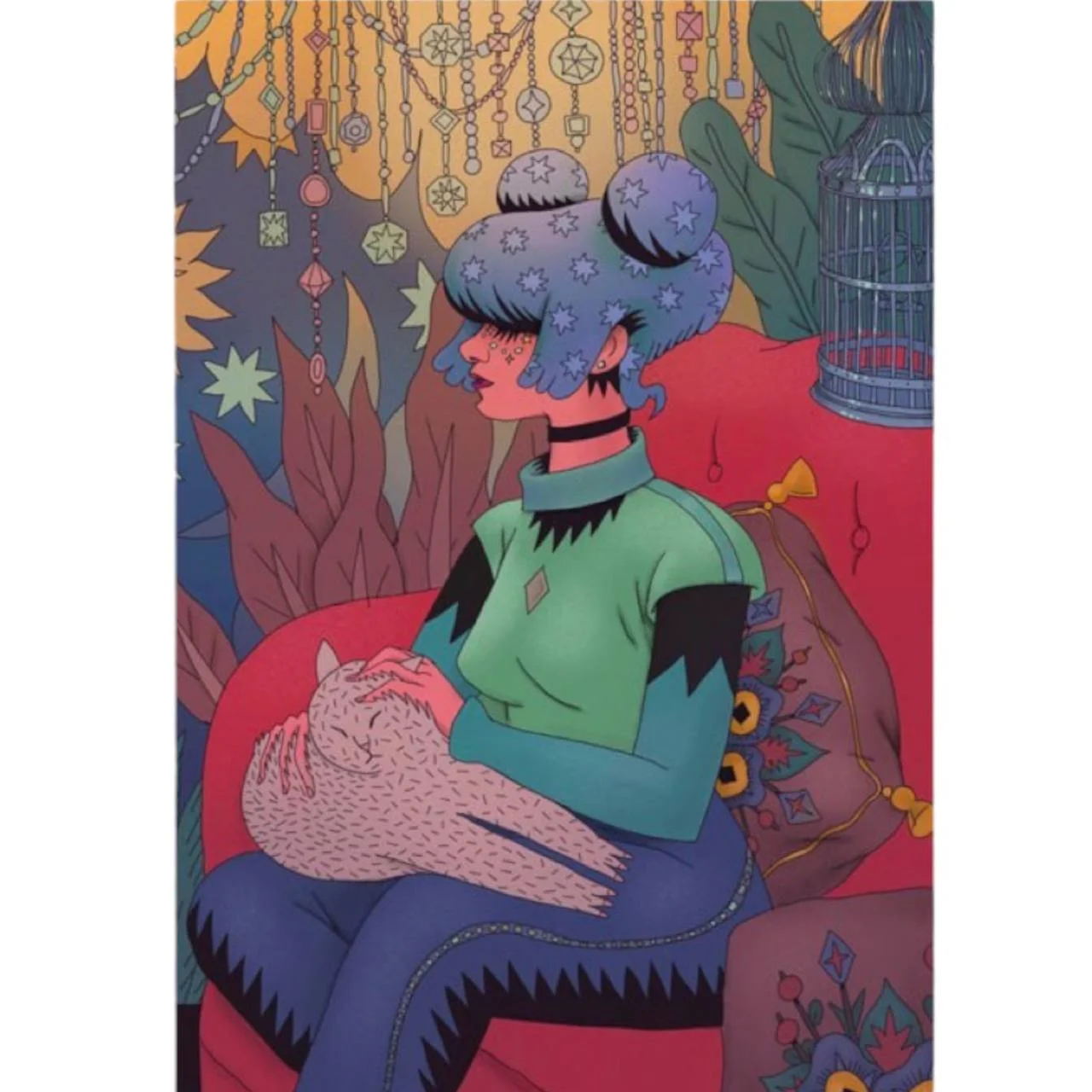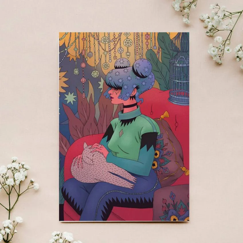 Открытка «Девушка с котом», художница из Санкт-Петербурга Валя Карнавалова.