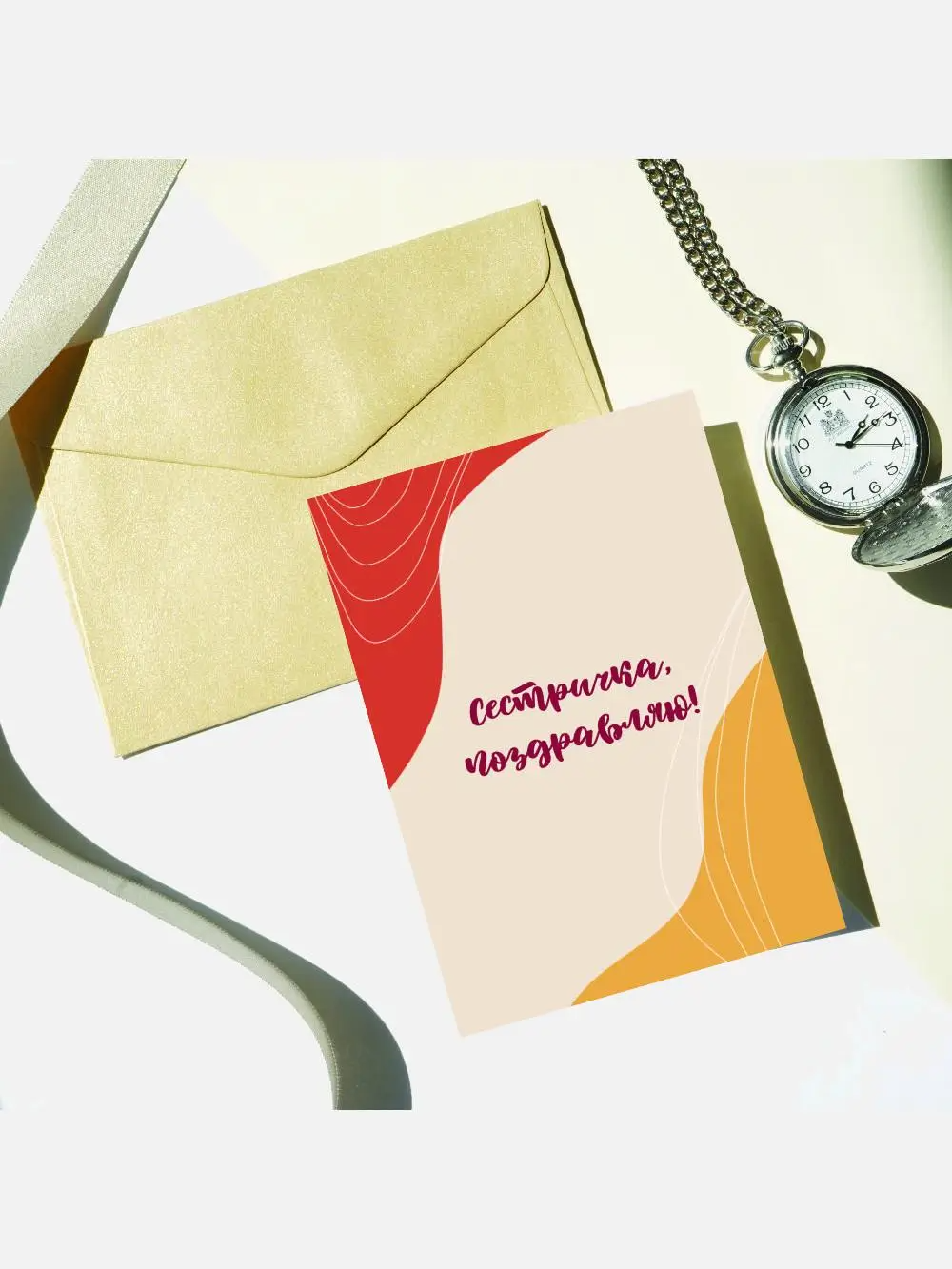 Стильная авторская открытка с надписью «Сестричка, поздравляю!» стандартного почтового размера: 100*150 мм. Минималистичный принт открытки со словами поздравлений и свободное место для подписи на обратной стороне делают её идеальным дополнением к любому подарку. Также для вашего удобства открытка упакована в индивидуальный крафтовый конверт. Печать выполнена на матовом картоне плотностью 300 г/м, что делает открытку более прочной и устойчивой к сгибам и другим внешним повреждениям.