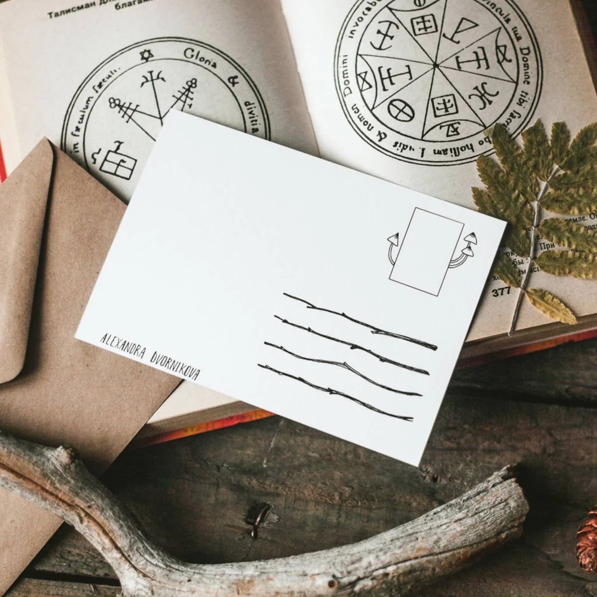 Открытка стандартного почтового размера: 105*148 мм упакована в индивидуальный крафтовый конверт. На обратной стороне есть свободное место для подписи, а также место под марку и адрес.