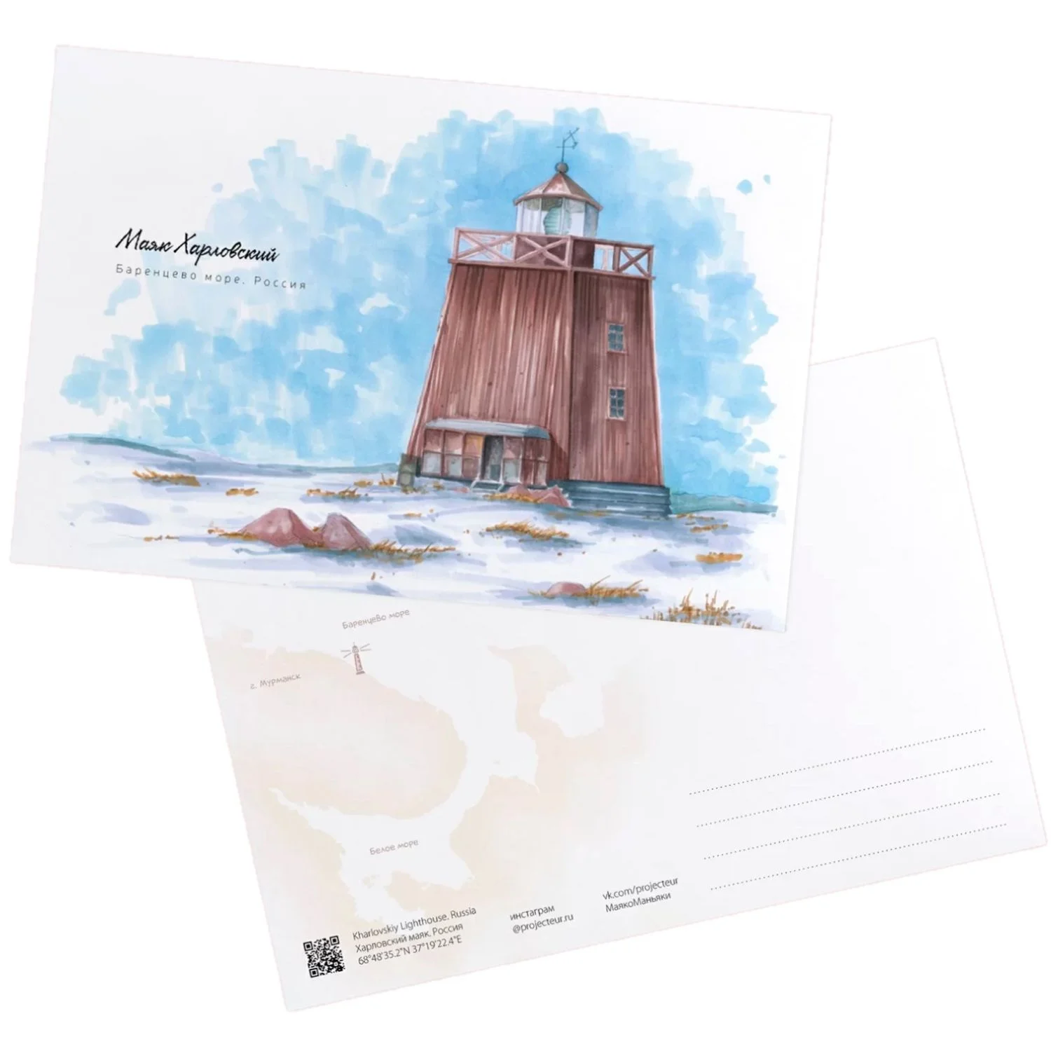 Открытка изготовлена из плотного дизайнерского картона с приятной шероховатой поверхностью. На обороте расположена схематическая карта, название и координаты маяка, а также место для написания адреса или приятных слов.