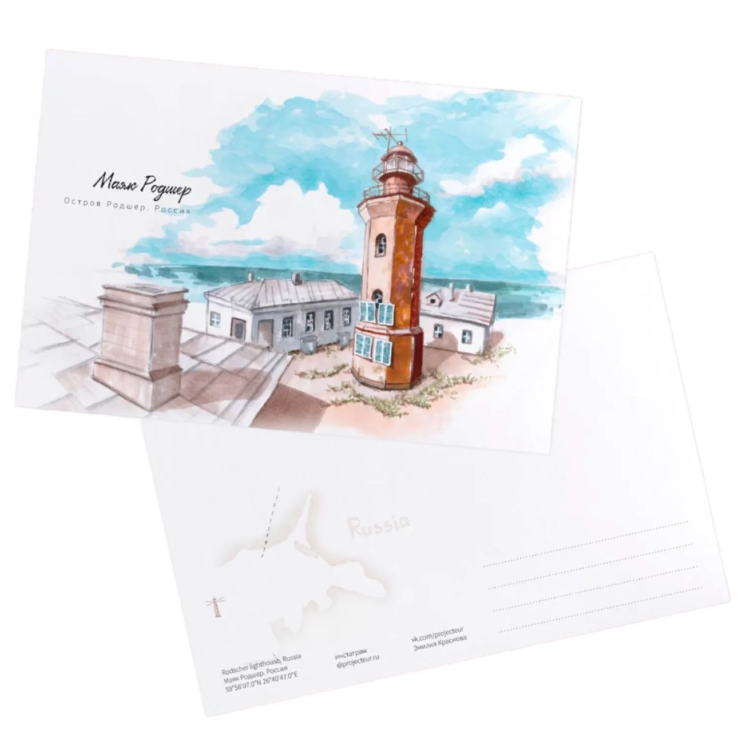 Открытка изготовлена из плотного дизайнерского картона с приятной шероховатой поверхностью. На обороте расположена схематическая карта, название и координаты маяка, а также место для написания адреса или приятных слов.