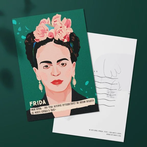 Открытка с цитатой художницы Фриды Кало: "Моя кровь - это чудо, которое путешествует по венам воздуха из моего сердца в твоё". Размер 10х15 см, печать на плотном картоне. Открытка бережно упаковывается в крафтовый конверт. Оборот открытки матовый: смело пишите ручкой и не бойтесь, что пожелание размажется. Есть разлинованное место для подписи и место для наклеивания марок.