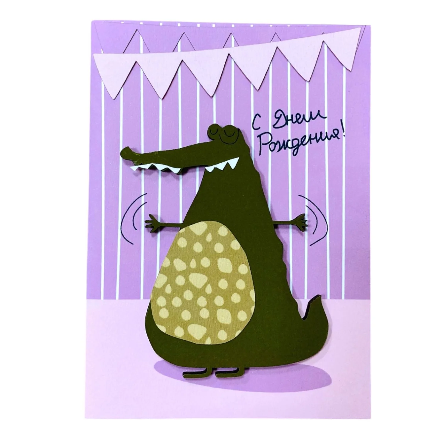 Открытка ВОЕ на День Рождения с деревянными элементами с крокодилом, открывающаяся