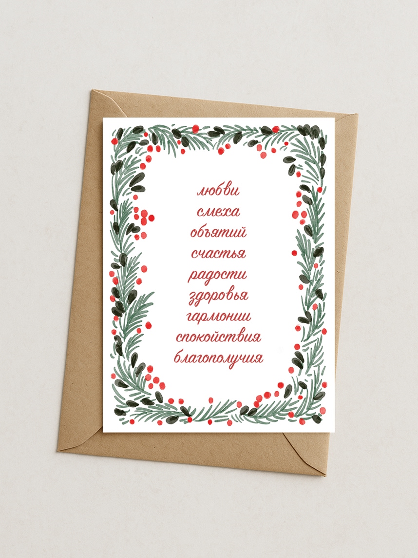 Авторская открытка на Новый год «Любви, смеха, объятий» выполнена в формате А6 на плотном картоне.
