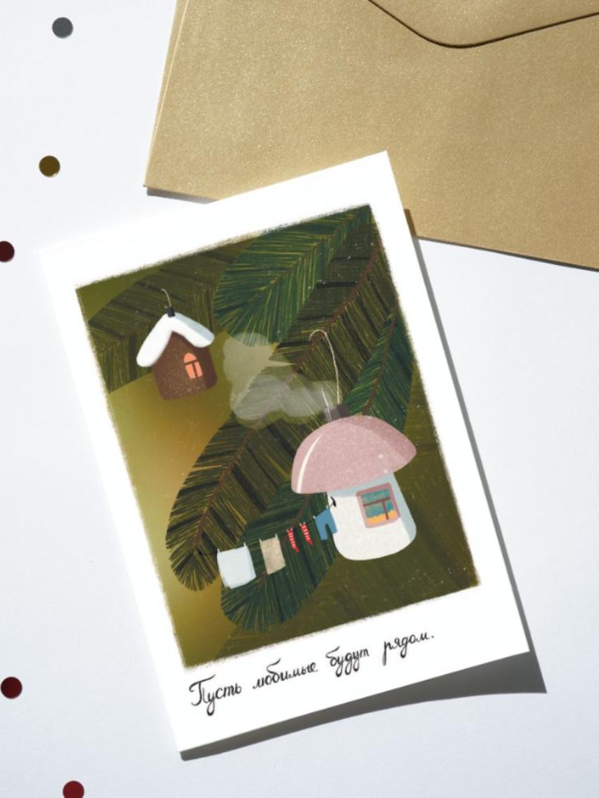 Новогодняя авторская открытка с милым домиком стандартного размера: 100*150 mm. Праздничный принт создан питерской художницей Марьей Иволгой. На обратной стороне есть свободное место для подписи - идеальное дополнение к подарку. Также для удобства открытка упакована в индивидуальный крафтовый конверт. Печать выполнена на картоне плотностью 300 г/м. Открытка односторонняя, не открывается.