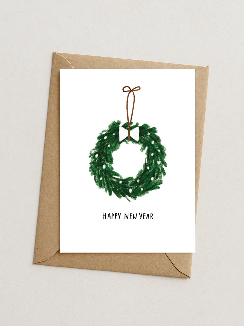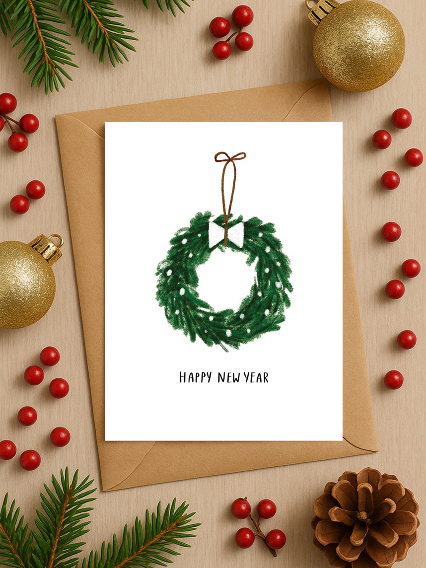 Открытка на Новый год «Рождественский венок» выполнена в формате А6 на плотном мерцающем картоне с мелким шиммером.