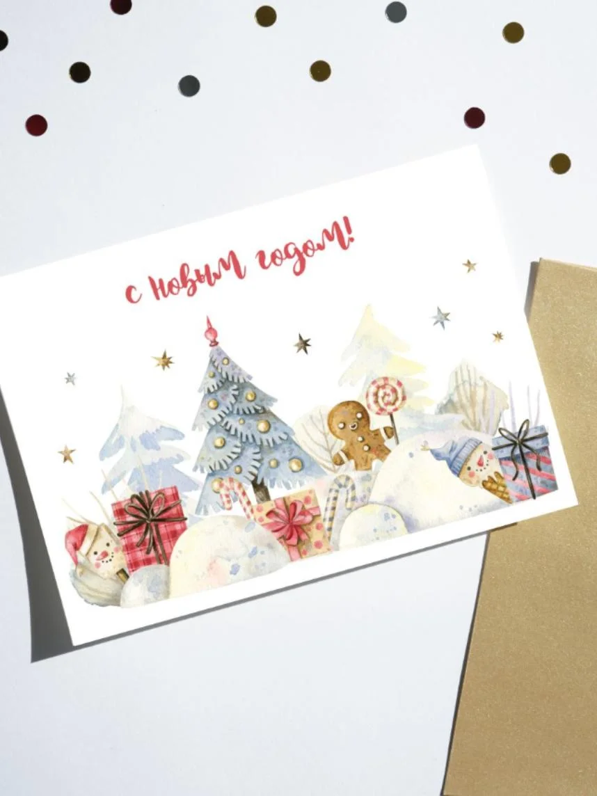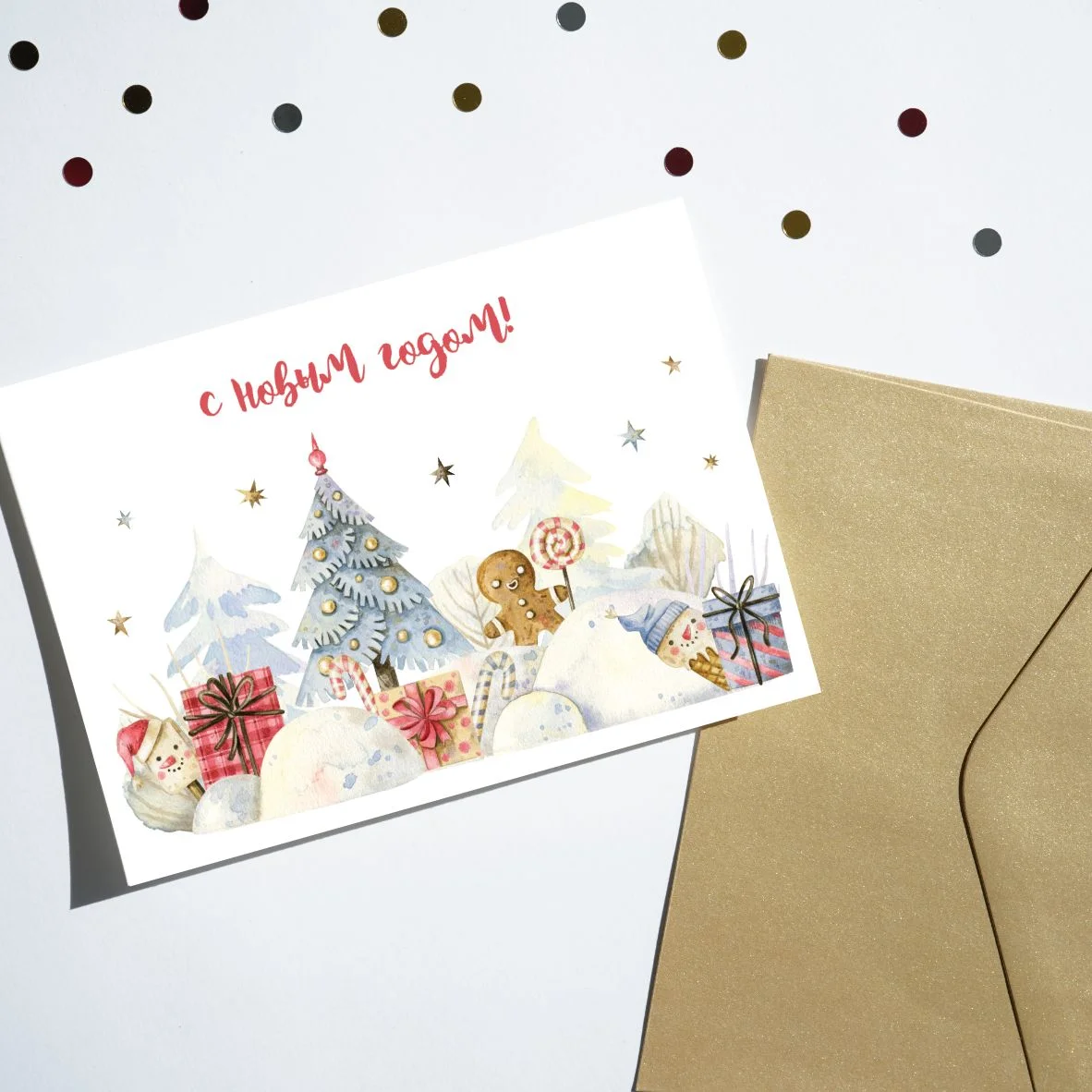 Новогодняя почтовая открытка с милым рисунком стандартного размера, 10*15 см. Праздничный принт открытки и свободное место для подписи на обратной стороне делают её идеальным дополнением к подарку на Новый Год и Рождество. Также для вашего удобства открытка упакована в индивидуальный крафтовый конверт. Печать выполнена на матовом картоне плотностью 300 г/м, что делает открытку более прочной и устойчивой к сгибам и другим внешним повреждениям. Открытка односторонняя, не открывается.
