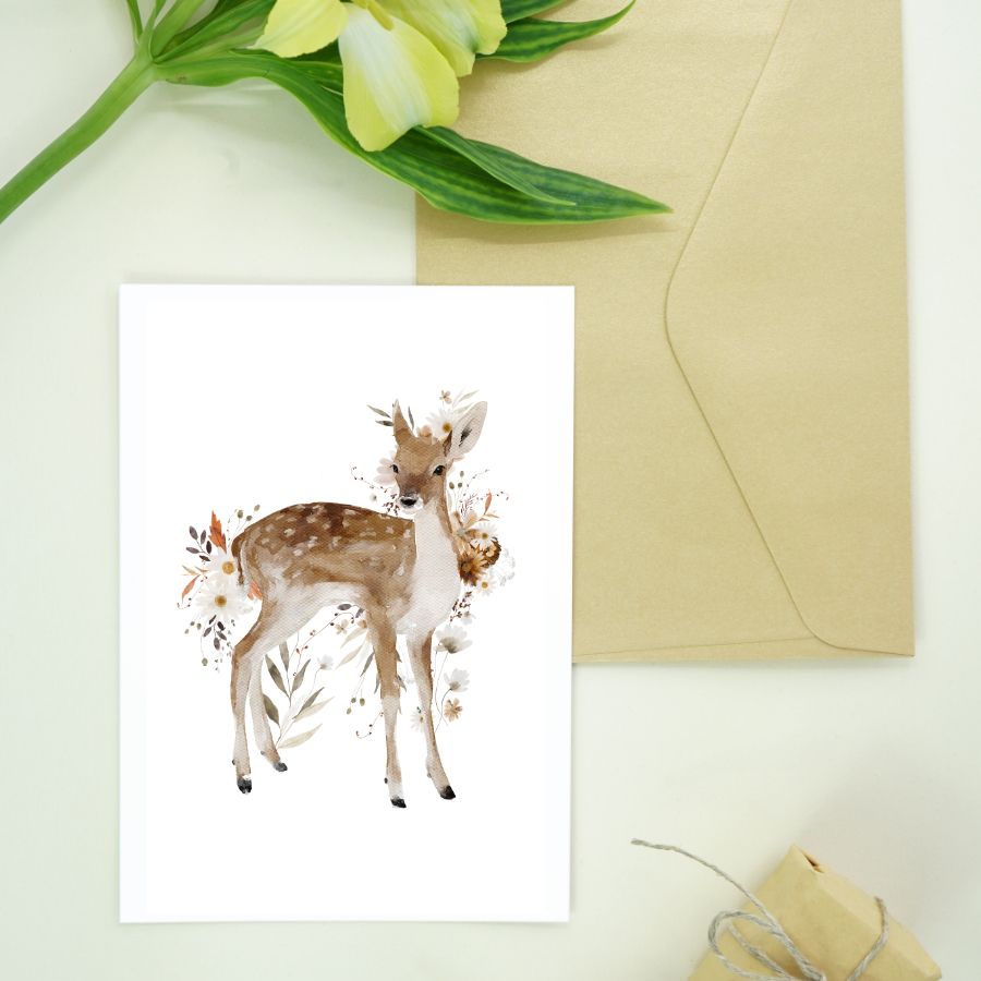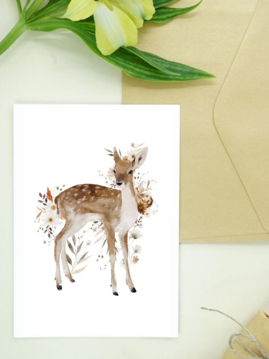 Авторская открытка уменьшенного формата. Иллюстрация с оленёнком и свободное место для подписи на обратной стороне делают открытку идеальным дополнением к любому подарку.