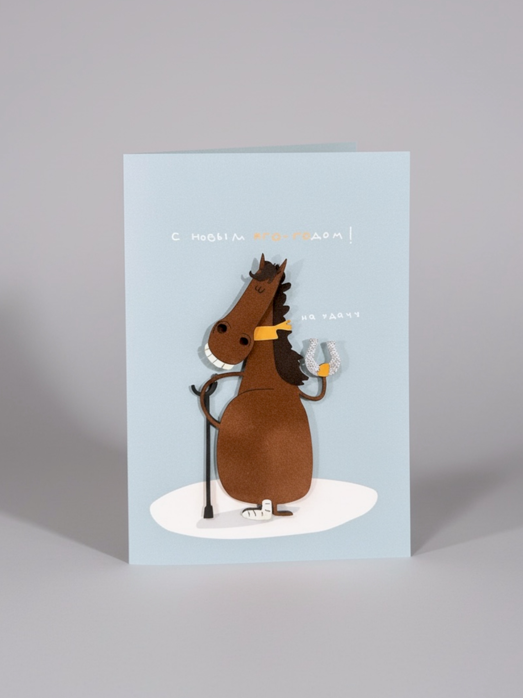 Открытка с деревянными элементами «C Новым иго-годом c конём и подковой», открывающаяся, BOE