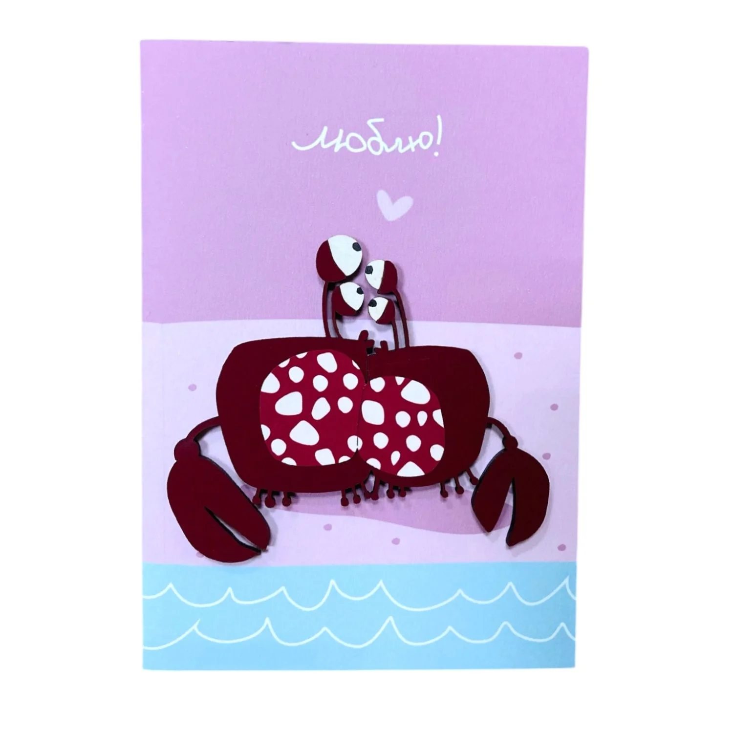 Открытка ВОЕ с деревянными элементами «Люблю» с крабами, открывающаяся