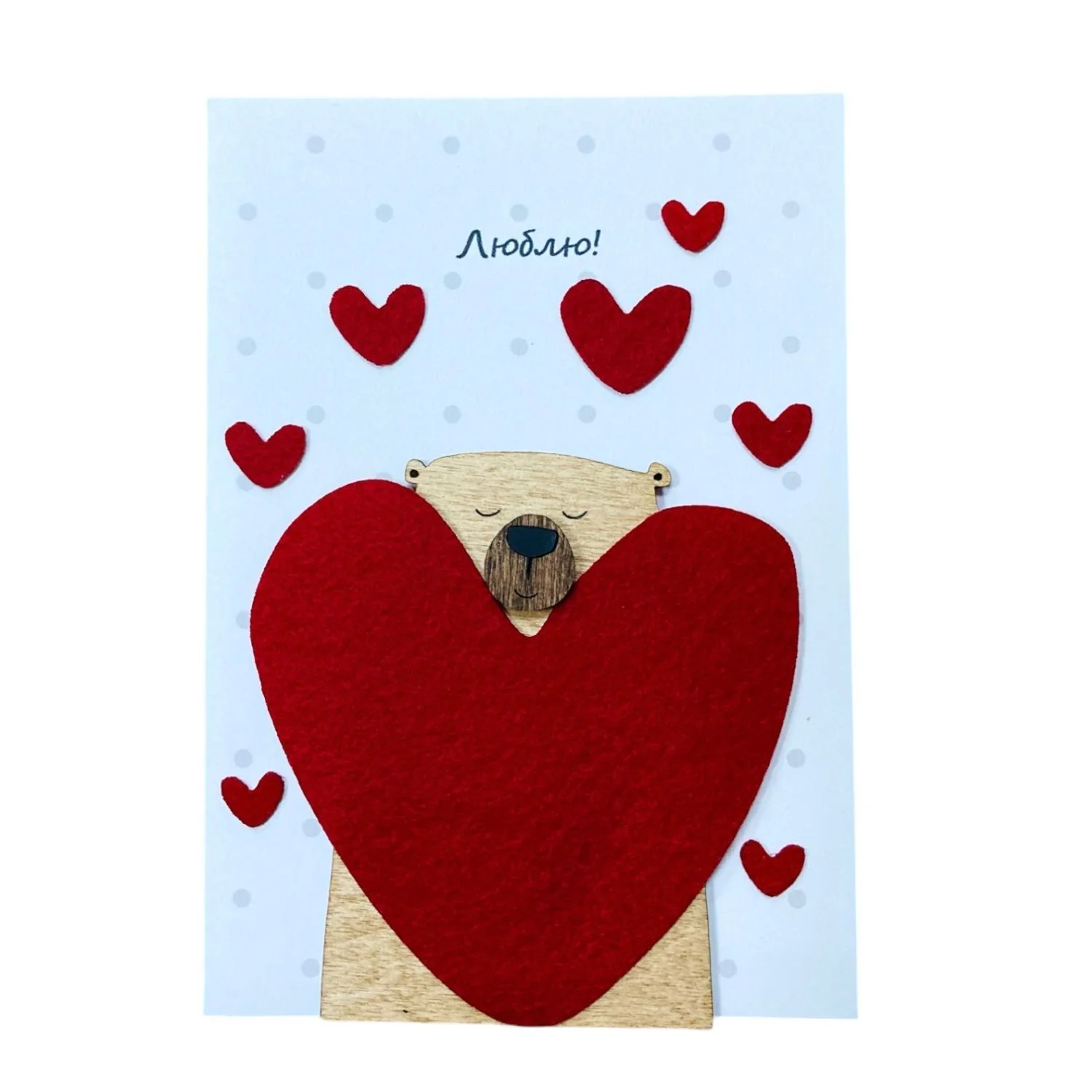 Открытка ВОЕ с деревянными элементами «Люблю» с медведем и красным сердцем, открывающаяся