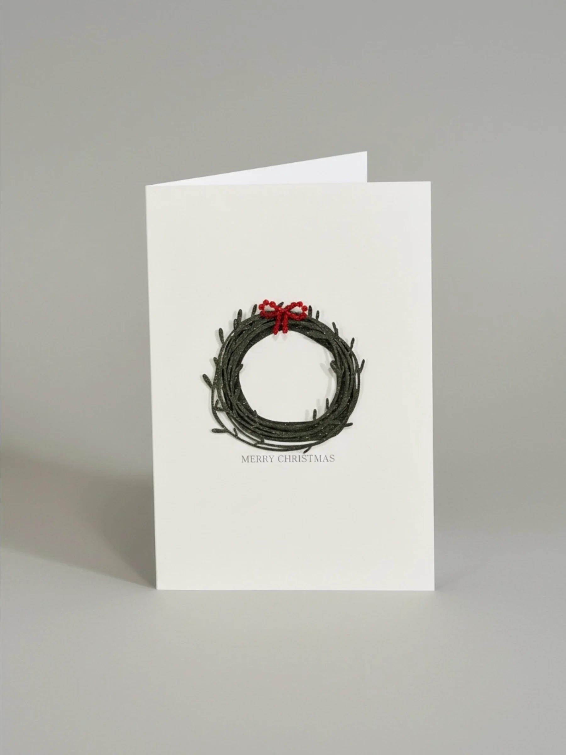 Фигурка елового венка сделана из дерева. Бумага с текстурой, открытка открывается, внутри нелинованная.