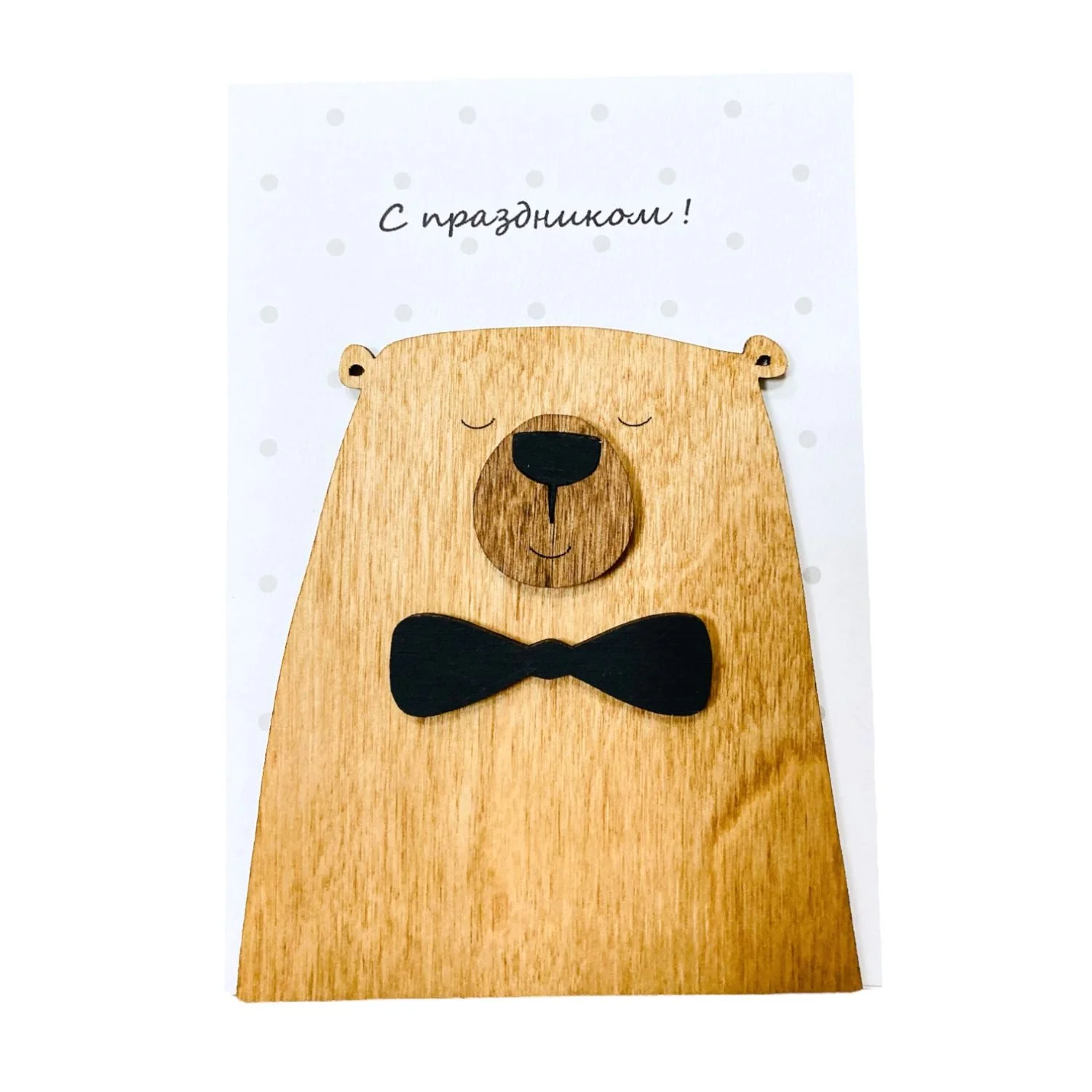 Открытка ВОЕ с деревянными элементами «С праздником!» с медведем, открывающаяся
