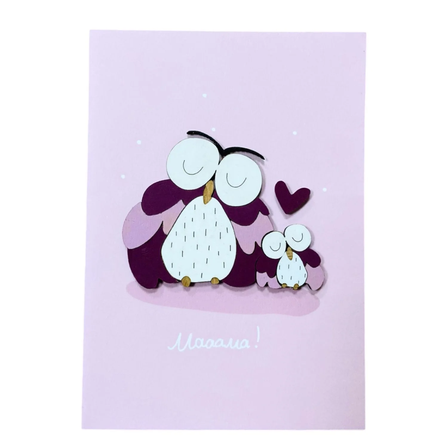 Оригинальная объёмная открытка с изображением мамы-совы и совёнка станет чудесным дополнением к подарку маме. Фигурки животных сделаны из дерева.