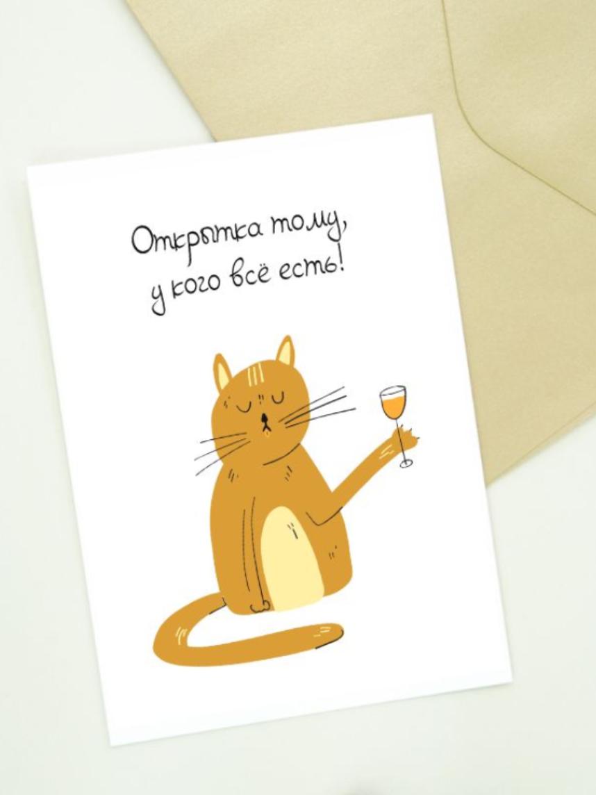 Авторская открытка с надписью «Открытка тому, у кого всё есть!» с изображением котика с бокалом - отличный подарок для тех, кто уже имеет все, что нужно. На обратной стороне есть свободное место для подписи - идеальное дополнение к подарку.