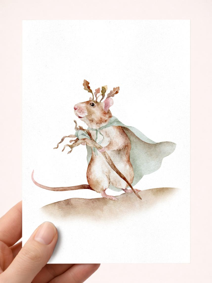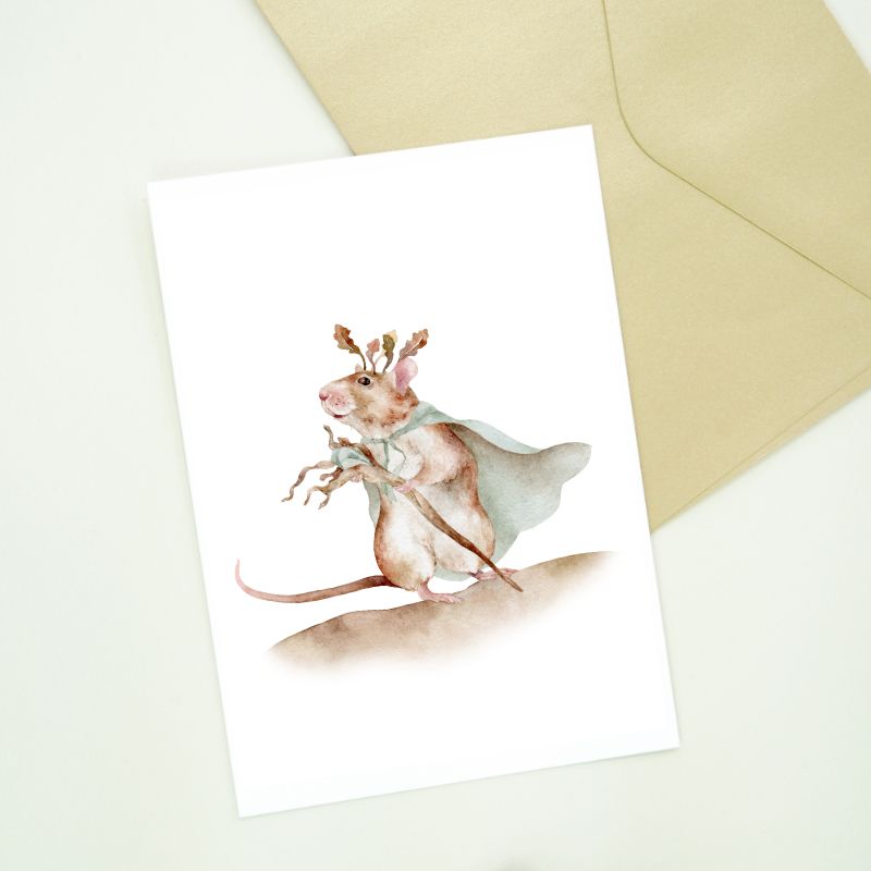 Иллюстрация с мышкой и свободное место для подписи на обратной стороне делают открытку идеальным дополнением к любому подарку.