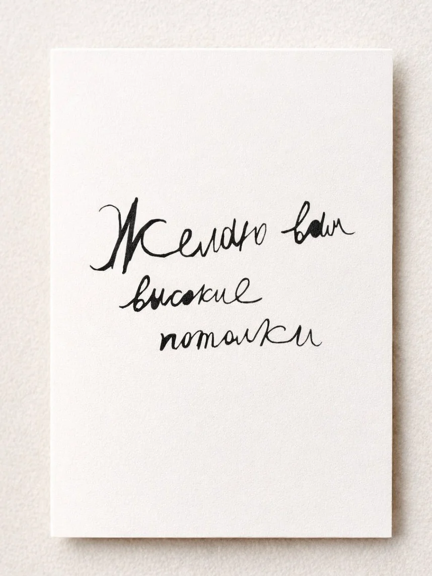 Открытка Антон тут рядом с надписью «Желаю вам высокие потолки», А6, белая