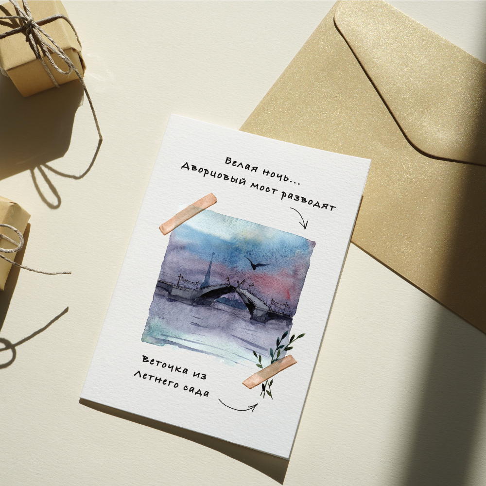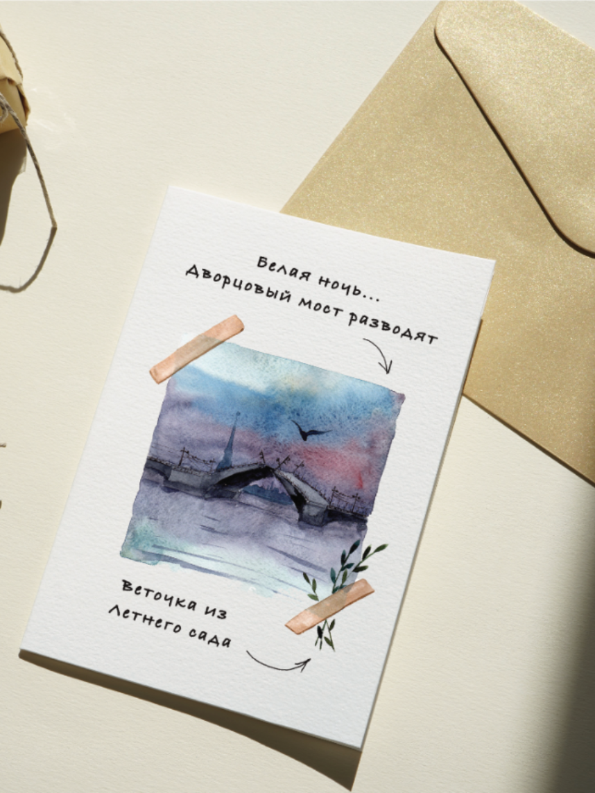 Авторская открытка с акварельным рисунком Дворцового моста размером 100*150 мм. Иллюстрация создана питерской художницей Марией Макаровой. Открытка односторонняя, не открывается. Упакована в индивидуальный крафтовый конверт. Печать выполнена на матовом картоне плотностью 300 г/м, что делает открытку прочной и устойчивой к повреждениям. Идеальное дополнение к подарку, на обратной стороне есть свободное место для подписи.