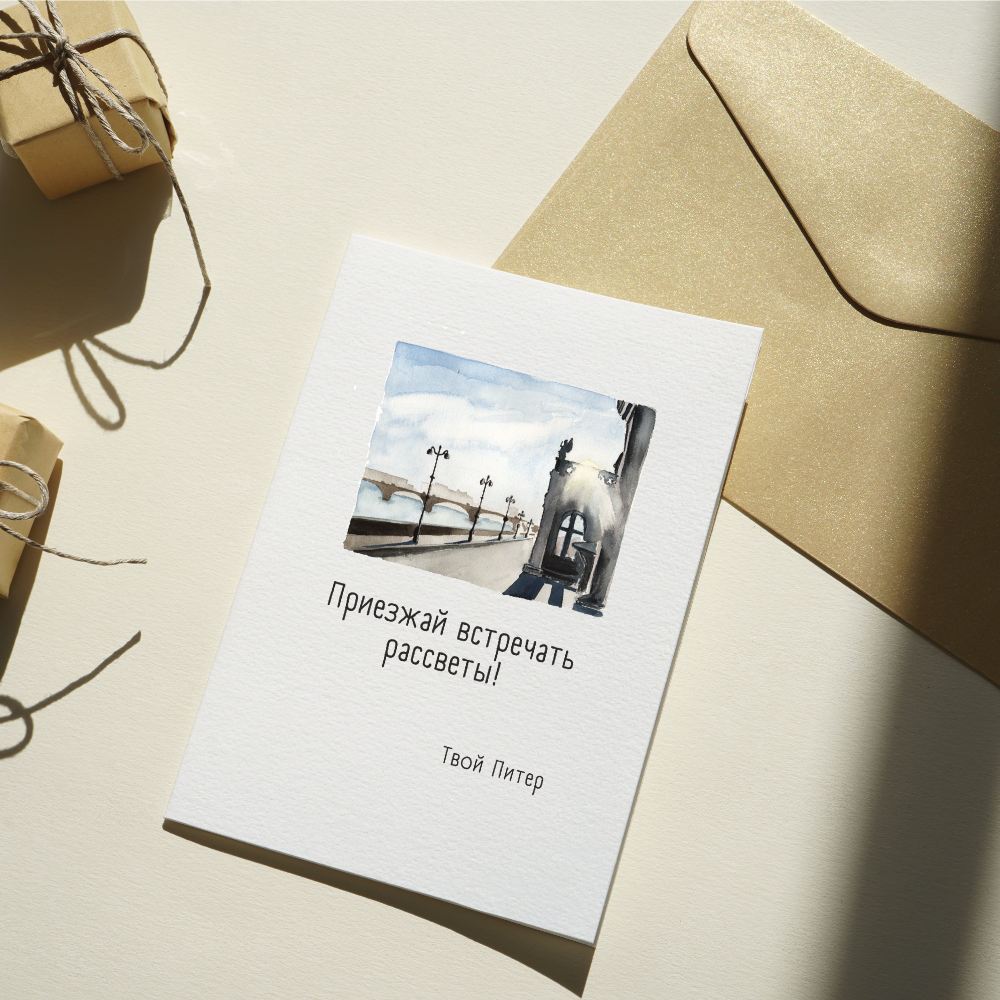 Авторская открытка с акварельным рисунком Питера размером 100*150 мм. Иллюстрация создана питерской художницей Марией Макаровой. Открытка односторонняя, не открывается. Упакована в индивидуальный крафтовый конверт. Печать выполнена на матовом картоне плотностью 300 г/м, что делает открытку прочной и устойчивой к повреждениям. На обратной стороне есть место для подписи.
