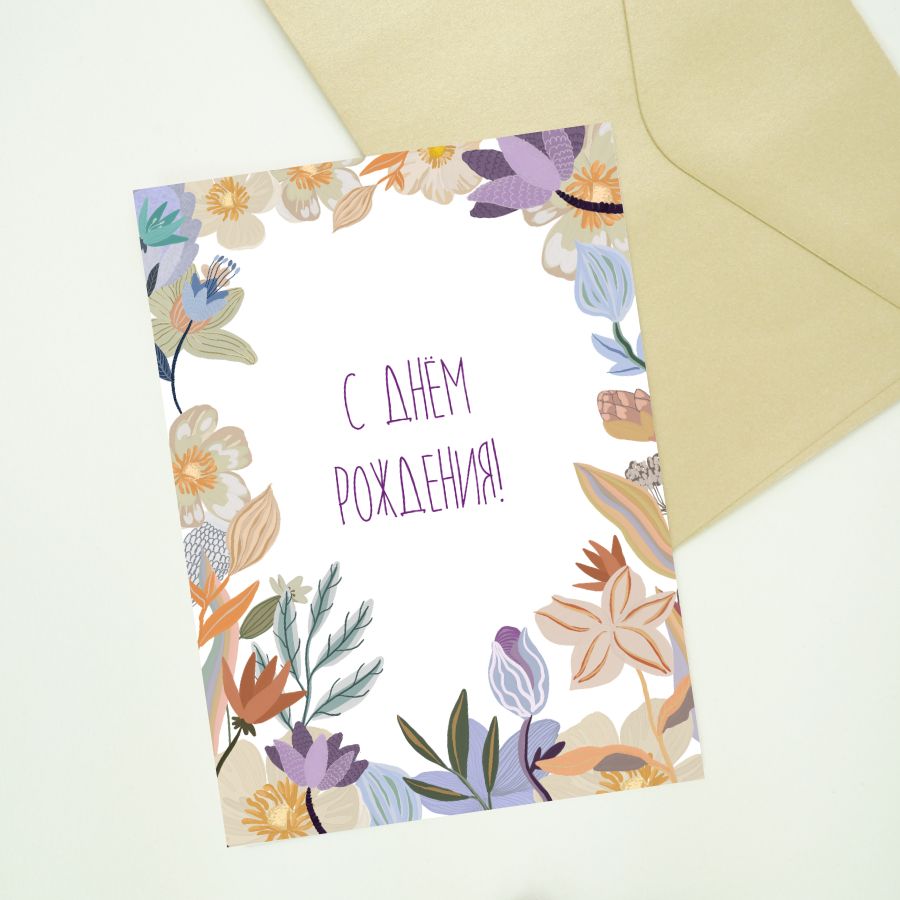 Авторская открытка с надписью «С Днём рождения». Цветы на открытке создают праздничное настроение. На обратной стороне есть свободное место для подписи - идеальное дополнение к подарку.