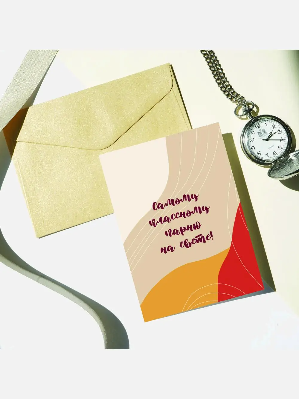 Стильная авторская открытка с надписью «Самому классному парню на свете» стандартного почтового размера: 100*150 мм. Минималистичный принт открытки со словами поздравлений и свободное место для подписи на обратной стороне делают её идеальным дополнением к любому подарку. Также для вашего удобства открытка упакована в индивидуальный крафтовый конверт. Печать выполнена на матовом картоне плотностью 300 г/м, что делает открытку более прочной и устойчивой к сгибам и другим внешним повреждениям.