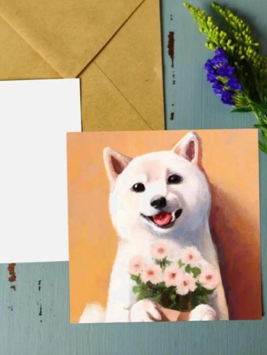 Милая открытка с белой сиба-ину с букетом цветов. Иллюстрация создана искусственным интеллектом. На обратной стороне есть свободное место для подписи. Открытка квадратная, размер 10*10 см. Открытка упакована в индивидуальный крафтовый конверт, односторонняя, не открывается. Печать выполнена на матовом картоне плотностью 300 г/м.