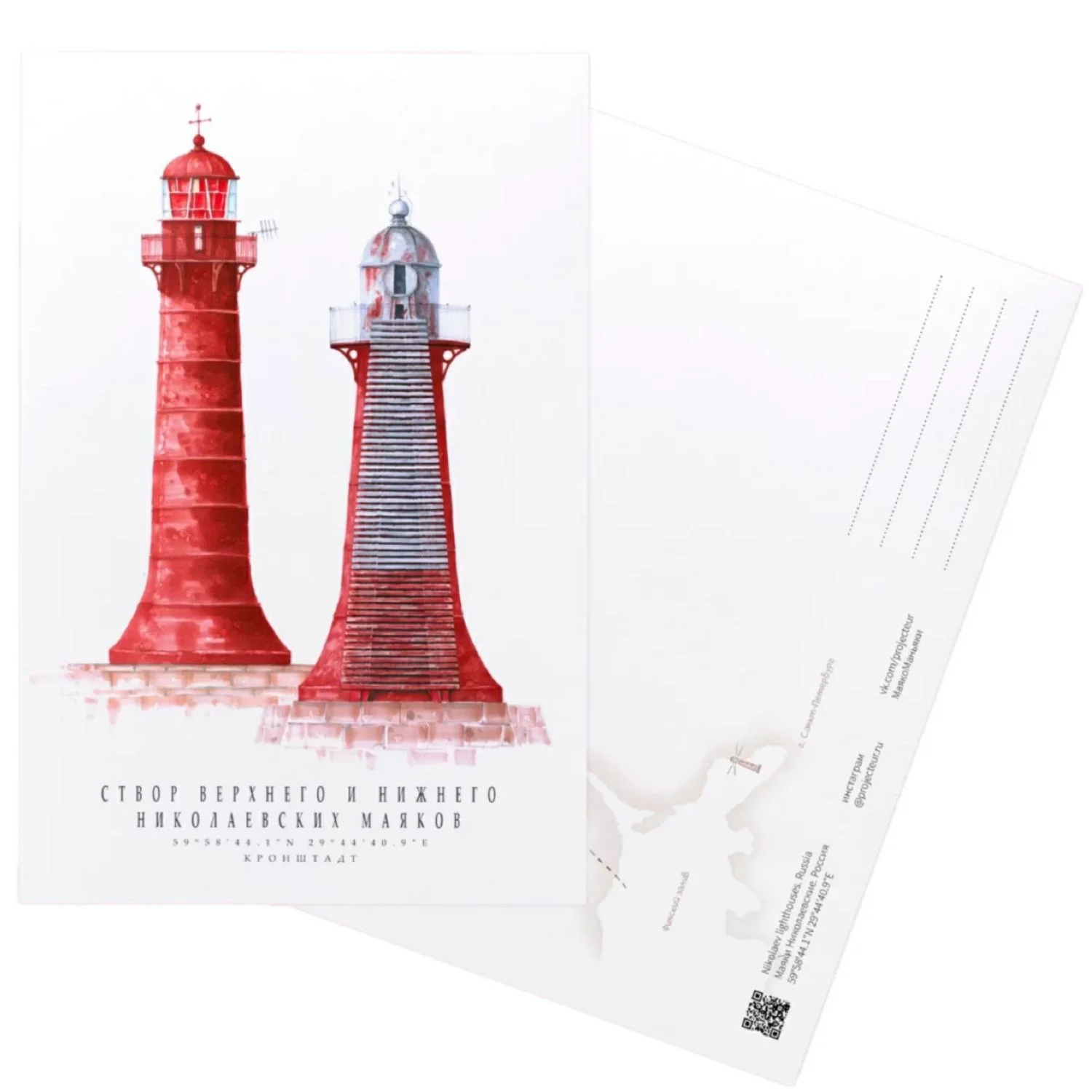 Открытка изготовлена из плотного дизайнерского картона с приятной шероховатой поверхностью. На обороте расположена схематическая карта, название и координаты маяка, а также место для написания адреса или приятных слов.
