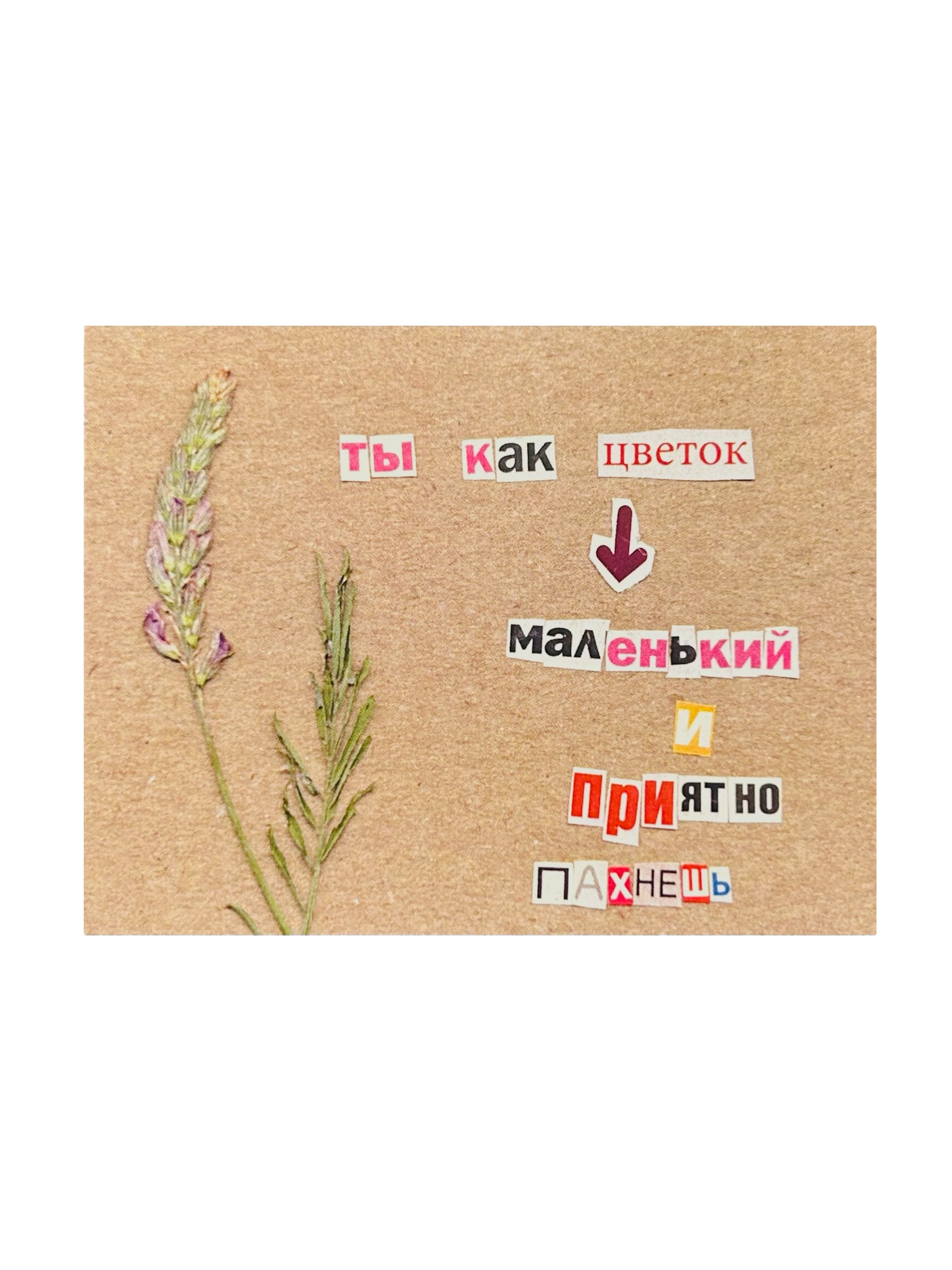 Милая и тёплая открытка размером 7х9 см в коричневых тонах с нежной надписью: «Ты как цветок, маленький и приятно пахнешь».