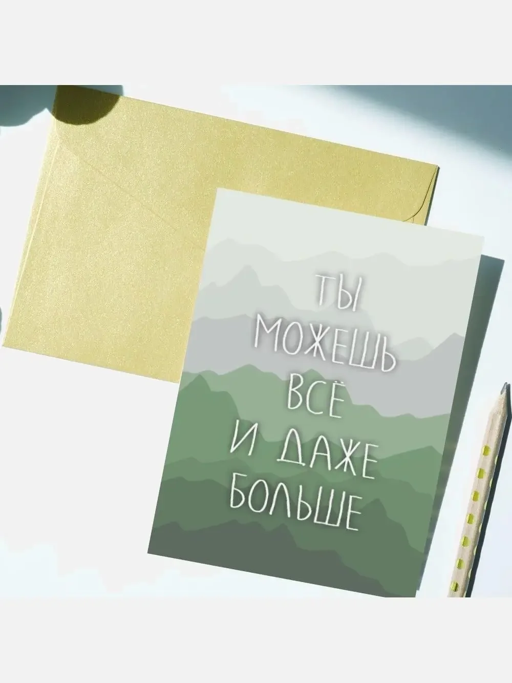 Стильная авторская открытка с надписью «Ты можешь всё и даже больше» стандартного почтового размера: 100*150 мм. Красивый минималистичный принт открытки с мотивирующими словами и свободное место для подписи на обратной стороне делают её идеальным дополнением к любому подарку. Также для вашего удобства открытка упакована в индивидуальный крафтовый конверт. Печать выполнена на матовом картоне плотностью 300 г/м, что делает открытку более прочной и устойчивой к сгибам и другим внешним повреждениям.