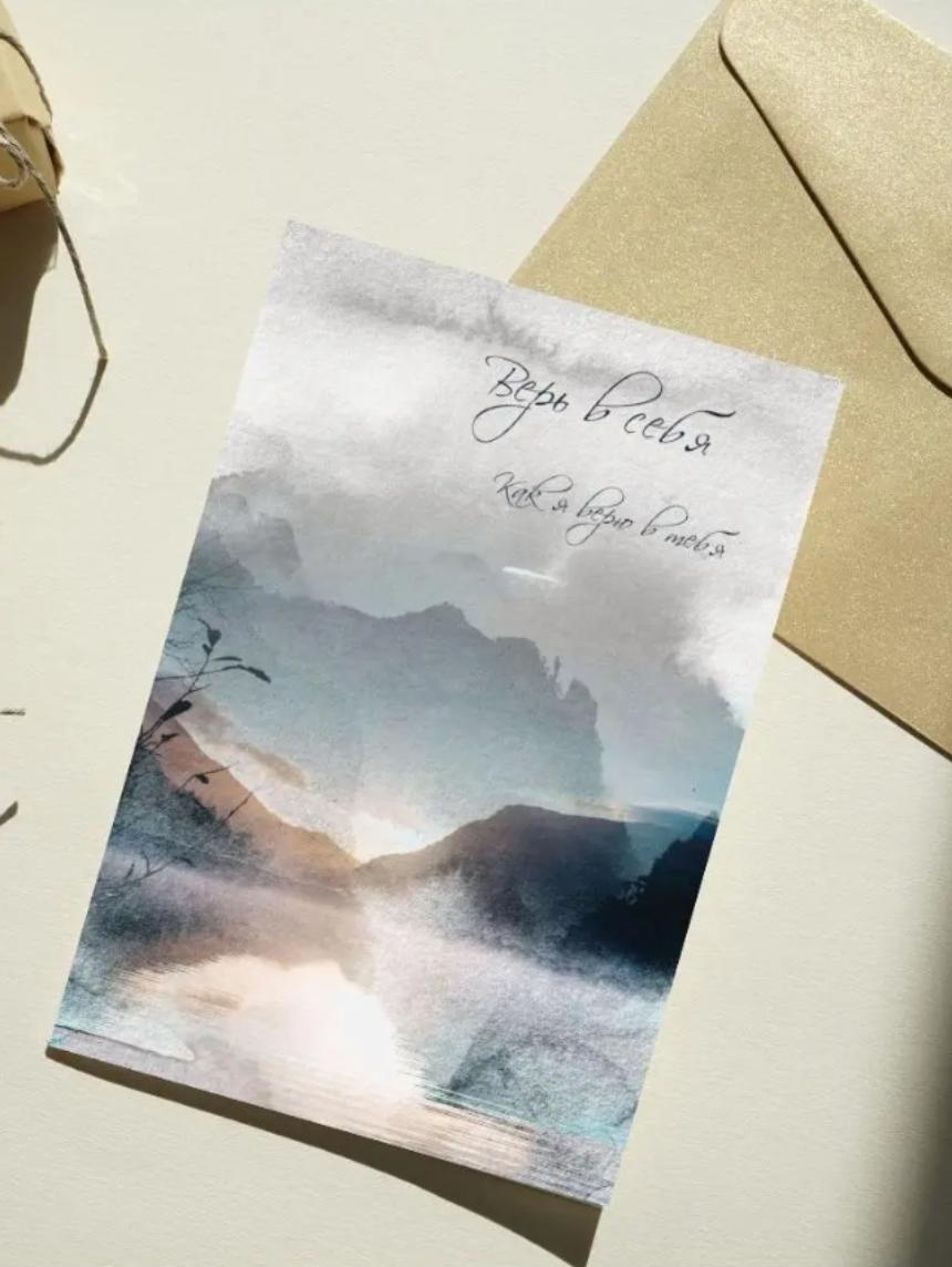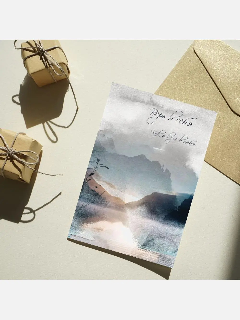 Авторская открытка уменьшенного формата, размер: 9*13 см. Иллюстрация с туманным пейзажем и свободное место для подписи на обратной стороне делают открытку идеальным дополнением к любому подарку. Открытка упакована в индивидуальный крафтовый конверт, печать выполнена на картоне плотностью 300 г/м. Открытка односторонняя, не открывается.