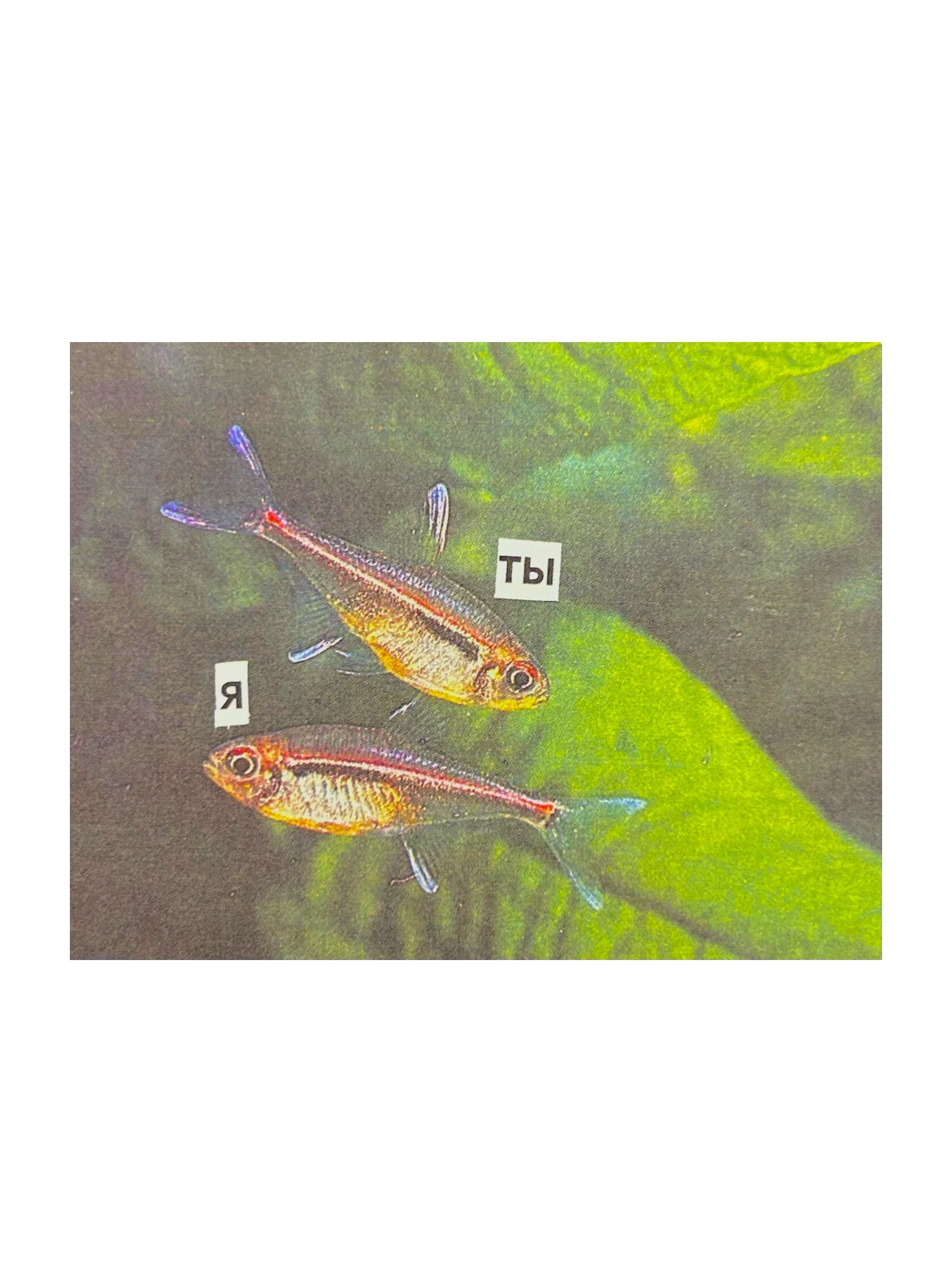 Очаровательная открытка размером 7х9 см в зелёных оттенках с изображением двух рыб — одна символизирует «я», другая — «ты».