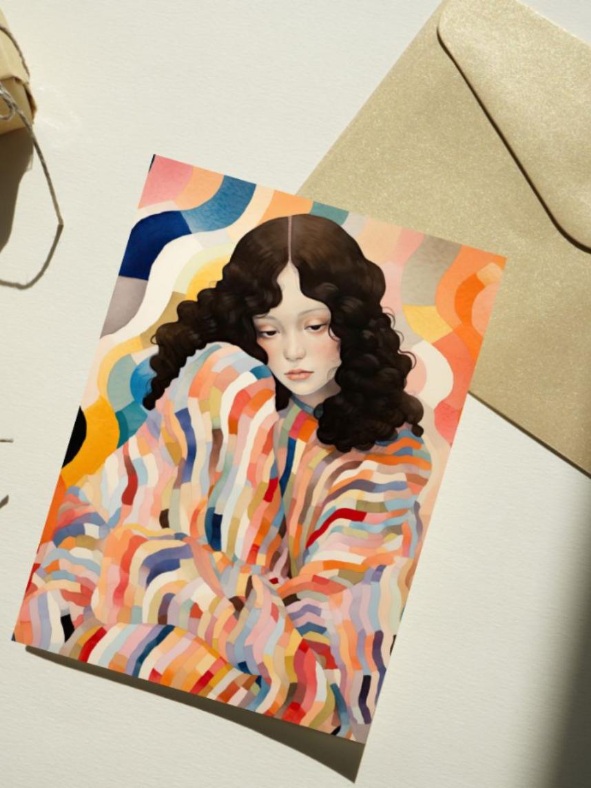 Яркая авторская открытка с задумчивой девушкой в ярком платье.