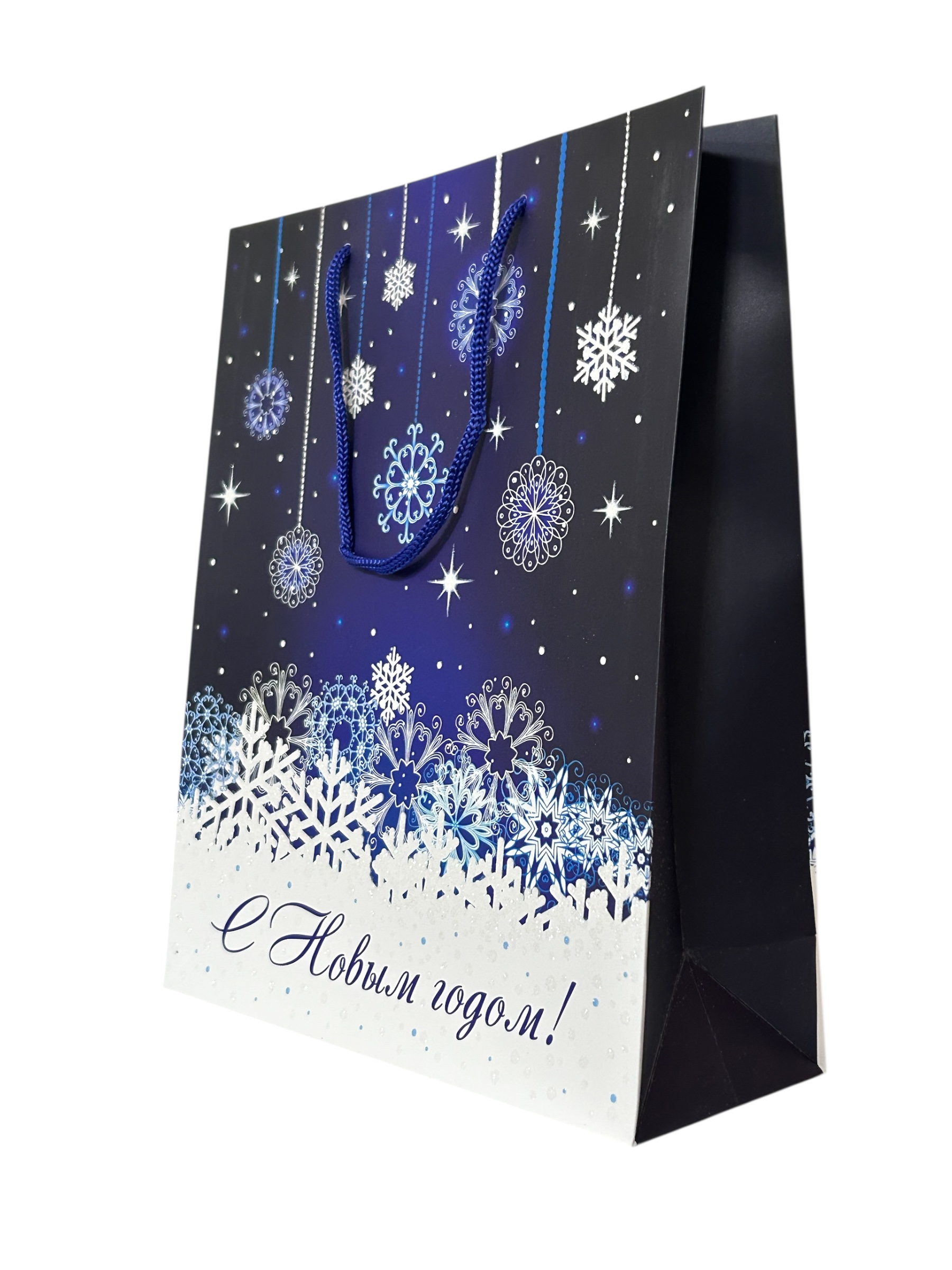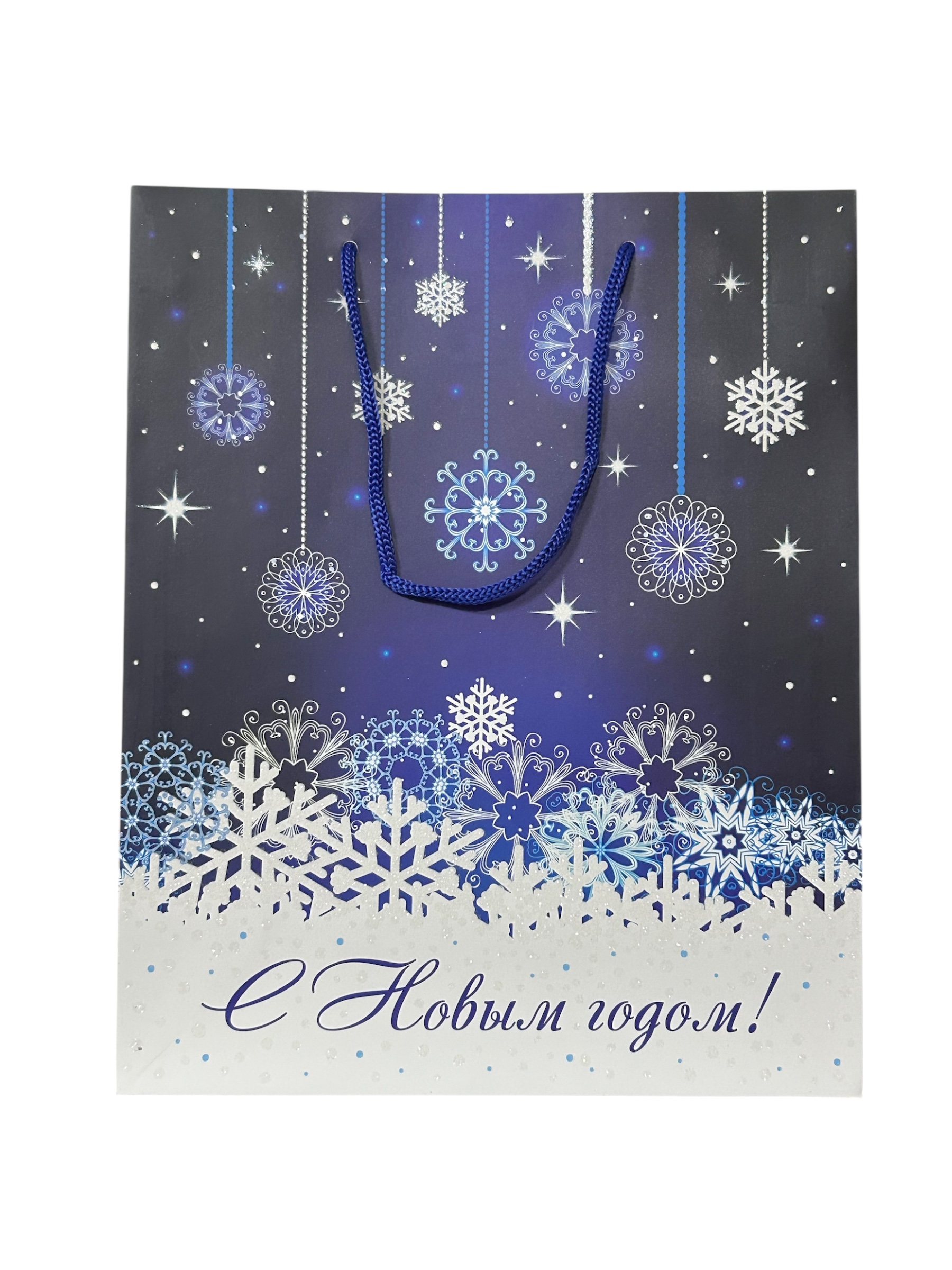 Пакет подарочный блестящий «Сияющие снежинки». Размер: 26х10х32см.