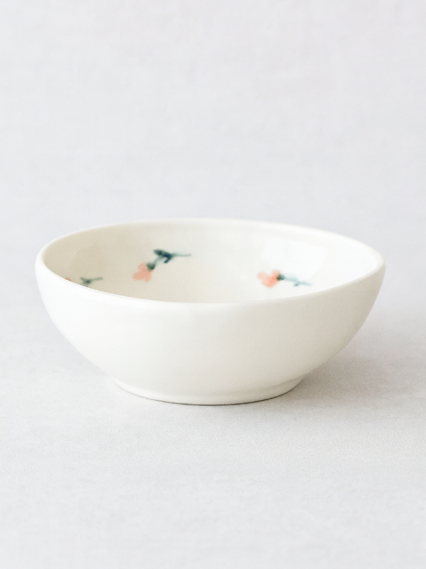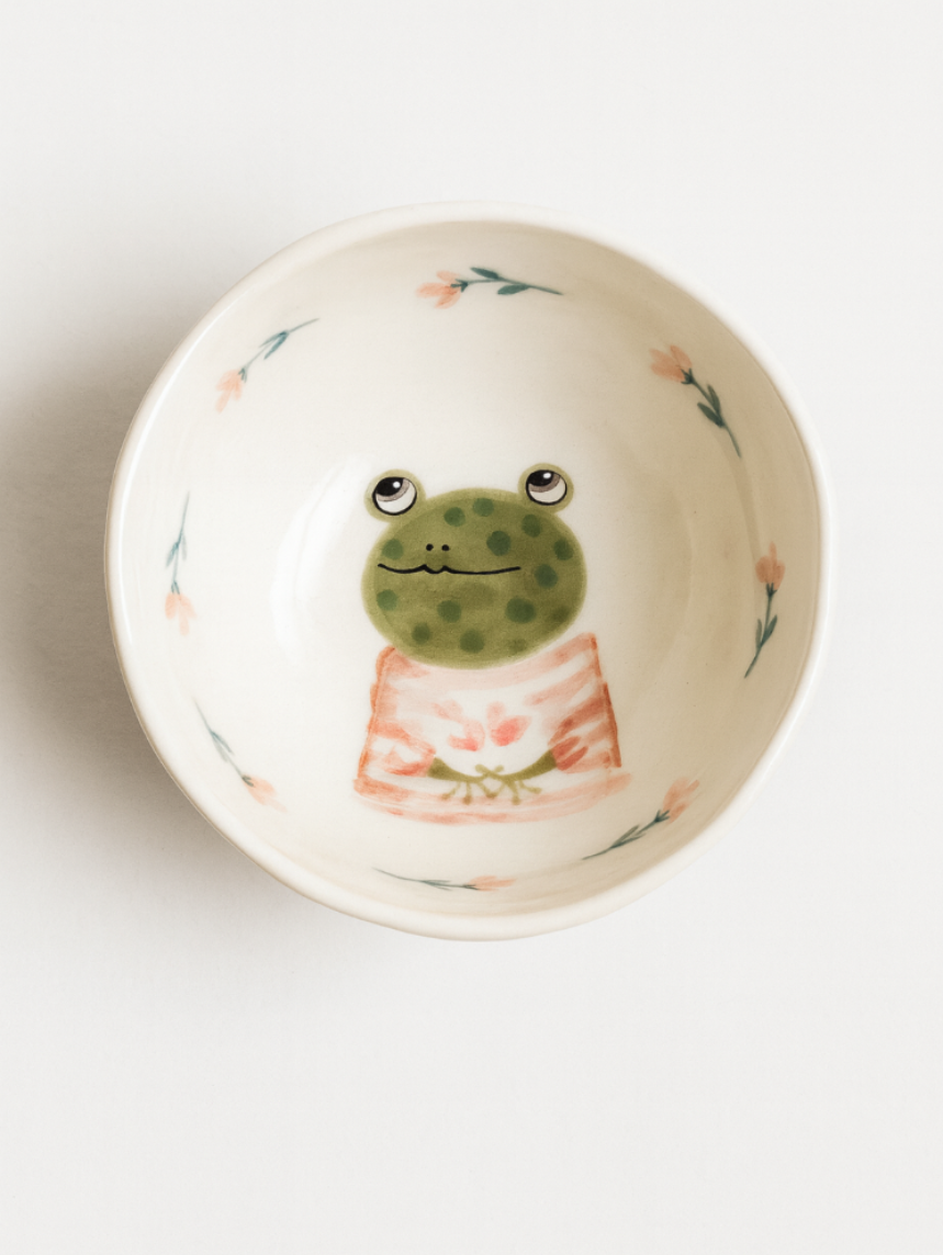 Пиала ручной работы с росписью внутри Лягушка с розовыми цветами, белая, фарфор, 10 см